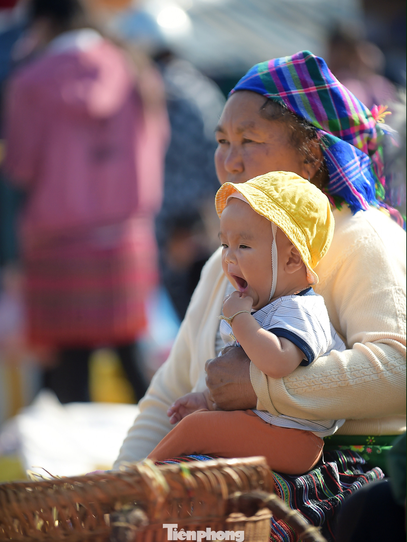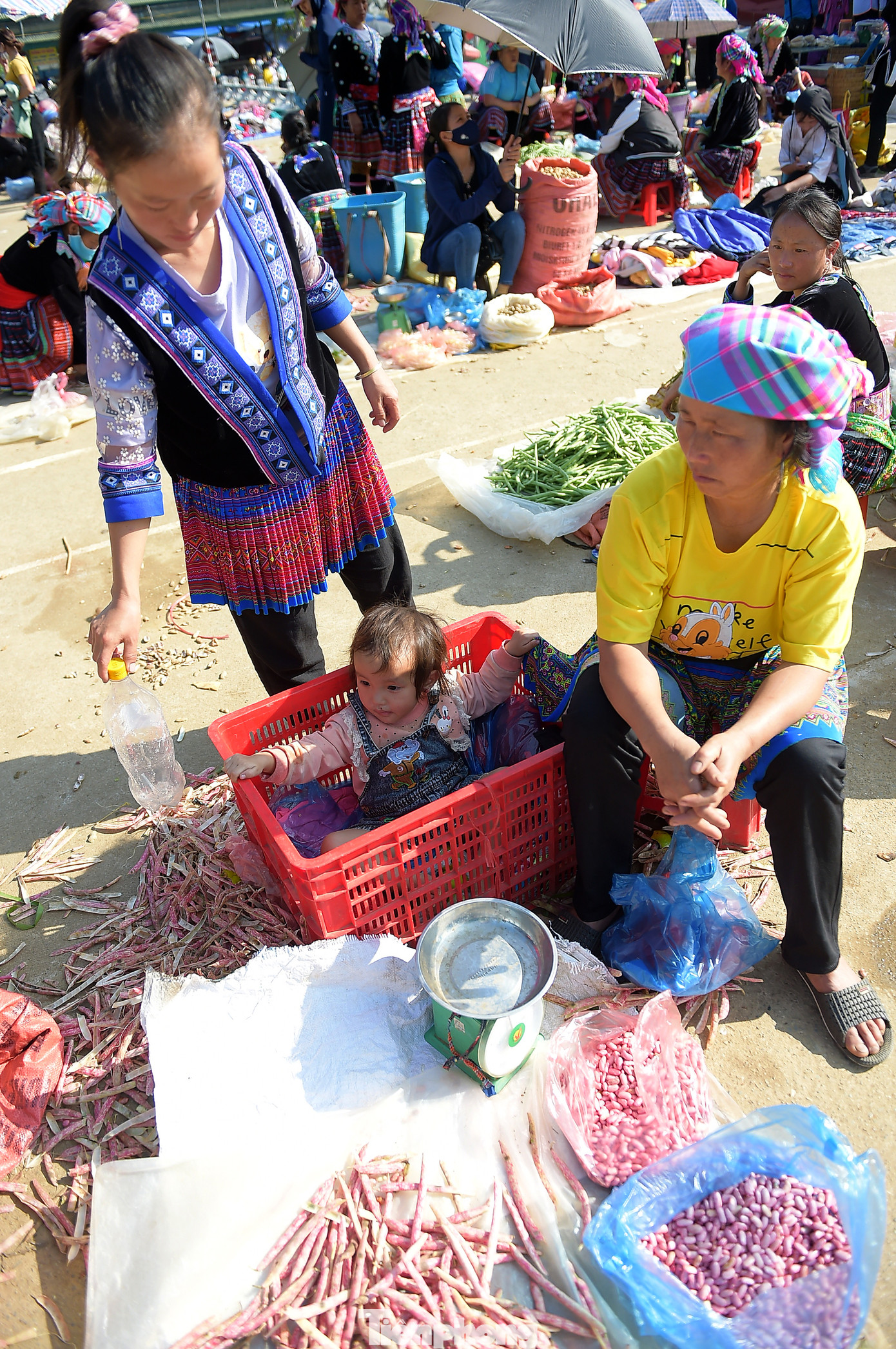 | Chợ San Thàng như nhiều phiên chợ vùng cao khác không chỉ có cảnh bán mua, trao đổi hàng hóa, còn có những cảnh yên bình của các bé con theo chân người nhà đến chợ. |