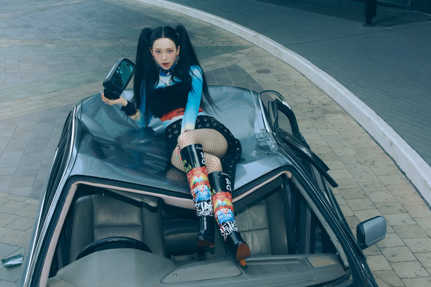 aespa theo đuổi concept thời trang thực tế ảo, trào lưu blue-core. Trang phục tông xanh, kiểu trang điểm, làm tóc nhấn nhá ánh nhũ xanh làm tăng vẻ siêu thực cho nhan sắc của Karina, Winter, Ningning.