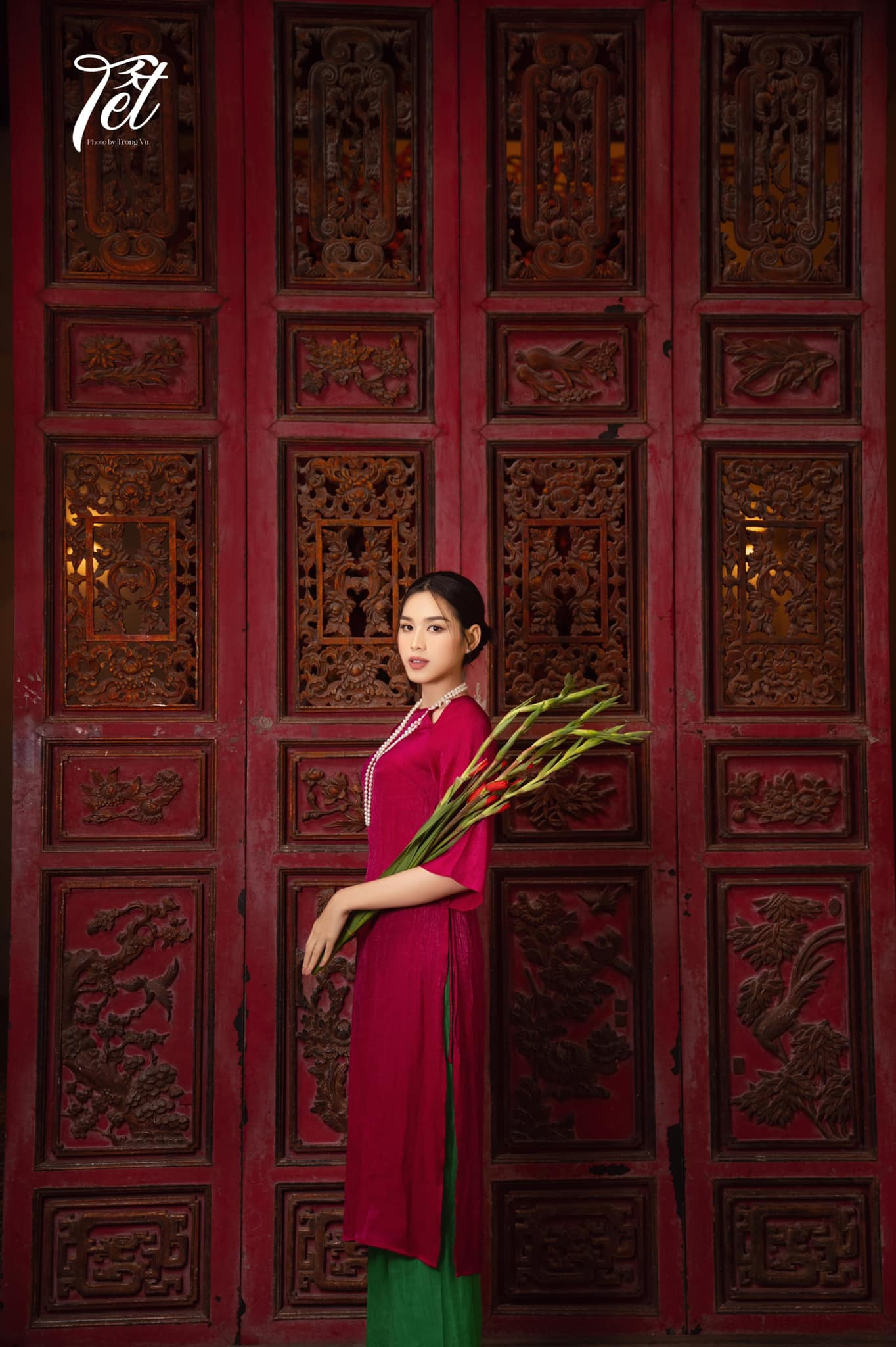 Hoa hậu Đỗ Thị Hà yêu kiều trong tà áo dài đỏ. Nàng hậu 22 tuổi ghi điểm nhờ cách "chơi màu" với quần màu xanh lá. Phụ kiện ngọc trai được Hoa hậu Việt Nam 2020 kết hợp khéo léo.