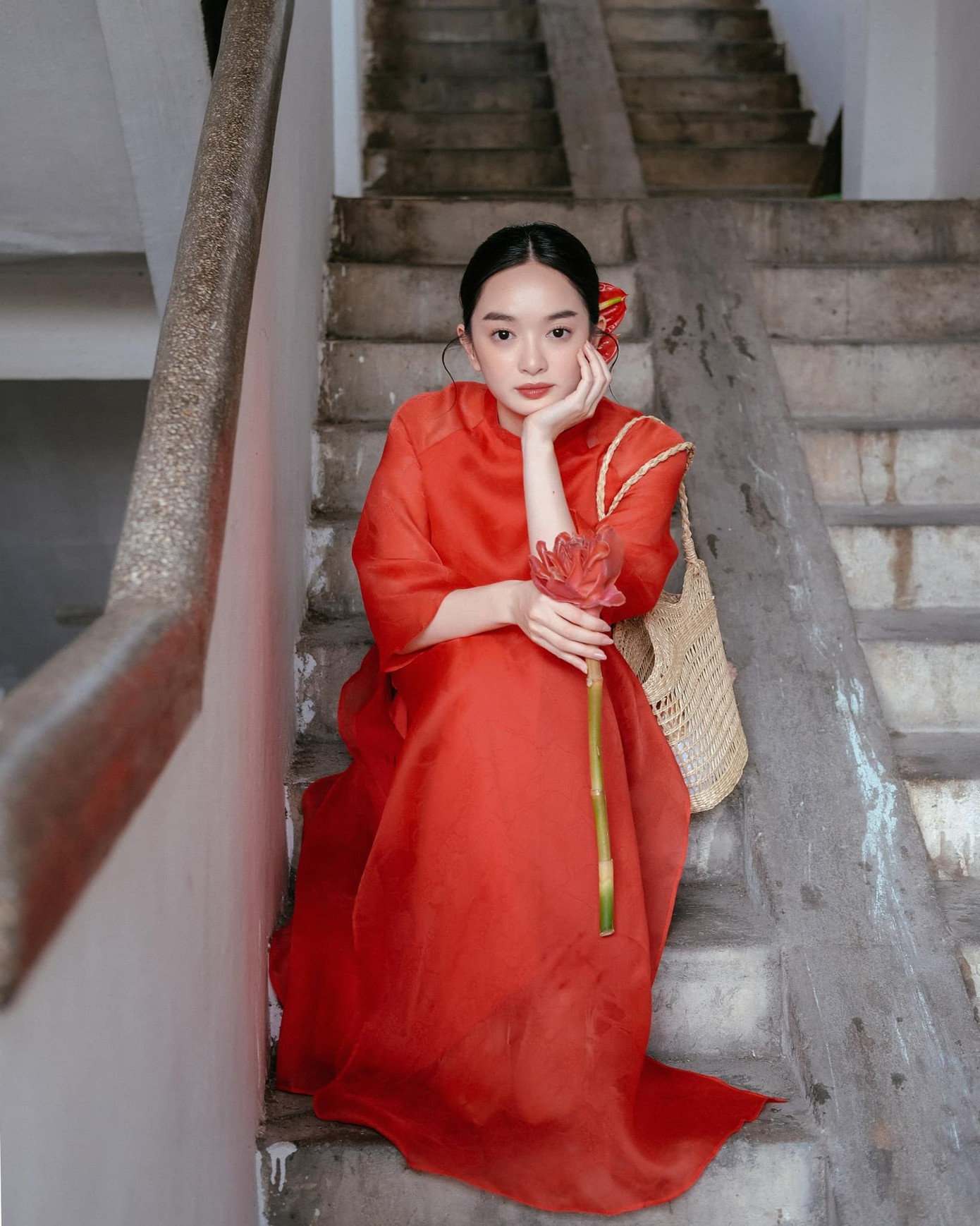 Á hậu Thảo Nhi Lê và diễn viên Kaity Nguyễn "đụng hàng" mẫu áo dài suông đỏ chất liệu organza. Trong khi Á hậu Thảo Nhi Lê phối cùng phụ kiện nơ thì Kaity Nguyễn yêu kiều cùng hoa hồng môn đỏ.