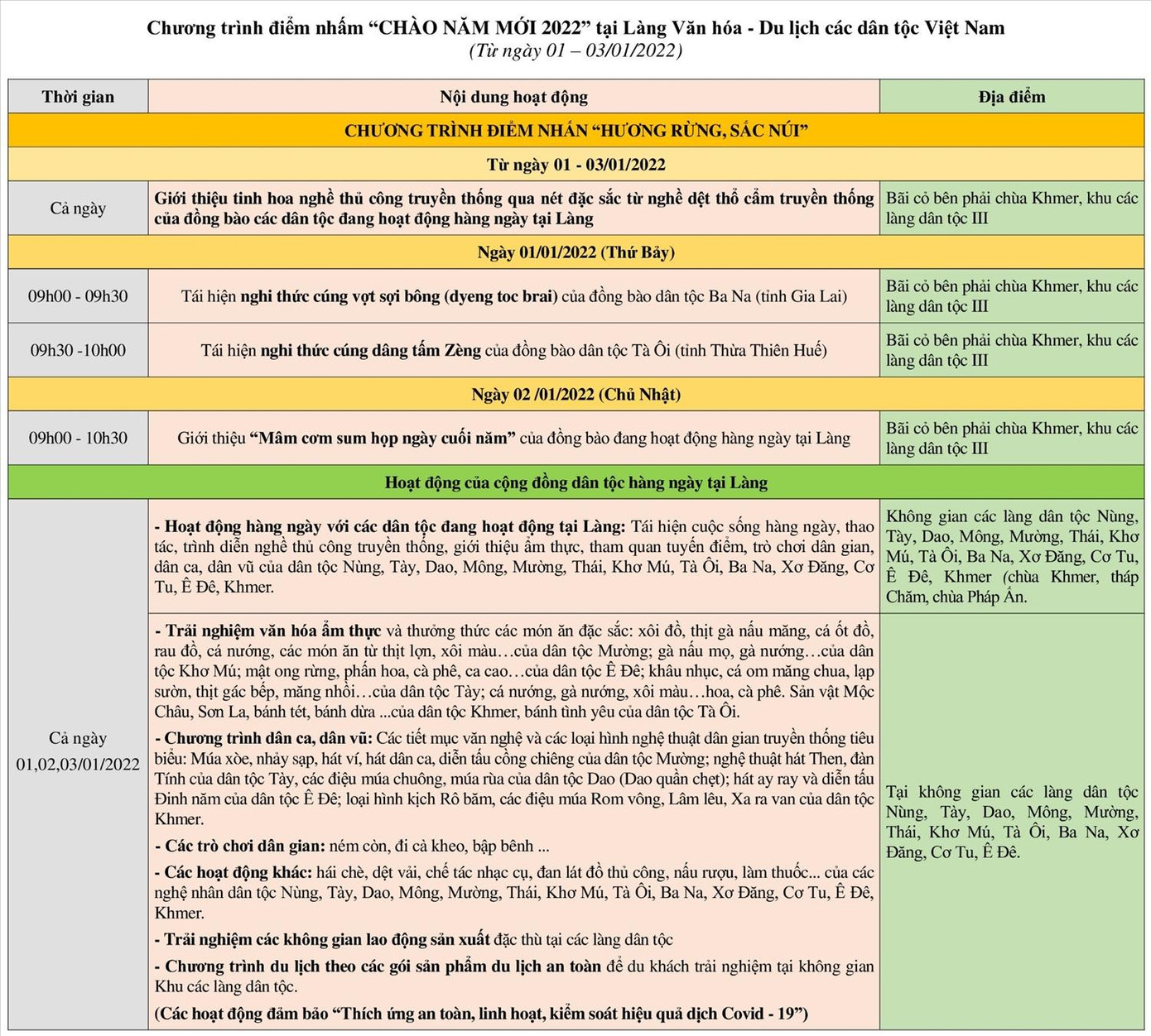 Bên cạnh các hoạt động văn hóa nghệ thuật đặc sắc “Chào năm mới 2022”, tại Làng Văn hóa - Du lịch các dân tộc Việt Nam còn diễn ra các hoạt động hàng ngày và hoạt động cuối tuần của các cộng đồng dân tộc đang sinh sống tại đây, gồm các chương trình dân ca, dân vũ, du lịch trải nghiệm, giới thiệu làm bánh, gói bánh phục vụ du khách, trò chơi dân gian; hoạt động cầu an, chúc phúc tại các không gian tâm linh chùa Khmer, tháp Chăm... giới thiệu nét văn hóa, phong tục tập quán của đồng bào, cùng các hoạt động trải nghiệm tại “Ngôi nhà chung” của cộng đồng 54 dân tộc Việt Nam…