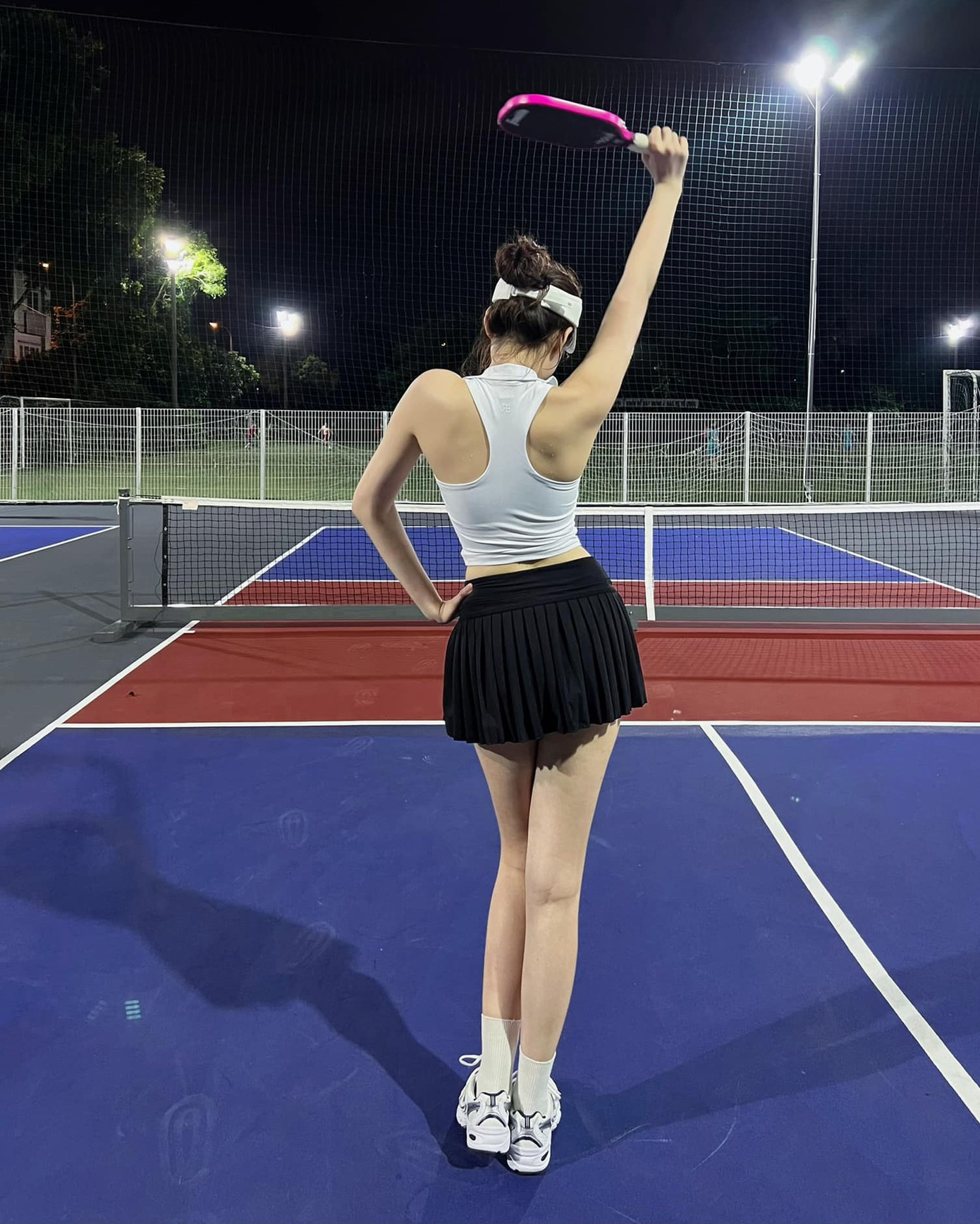 Bạn thân của Huyền Lizzie là Quỳnh Nga thường xuyên diện đồ ôm sát đi tập yoga và khi chuyển sang pickleball, cô tiếp tục theo style tôn dáng triệt để với áo bó và váy xòe ngắn một gang tay.