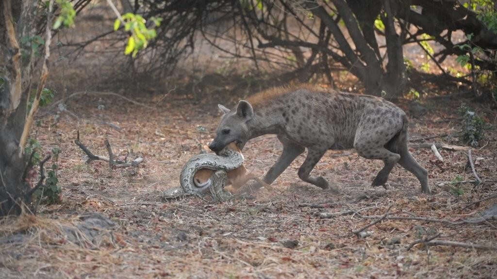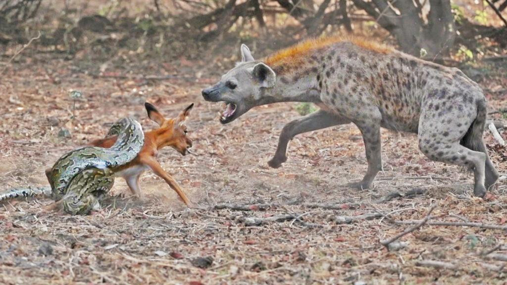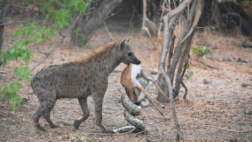 Linh cẩu nhận thấy rõ món hời, nó lao vào cố gắng kéo linh dương ra khỏi con trăn nhưng không thành công. Sau đó một trò chơi mèo vờn chuột bắt đầu.
