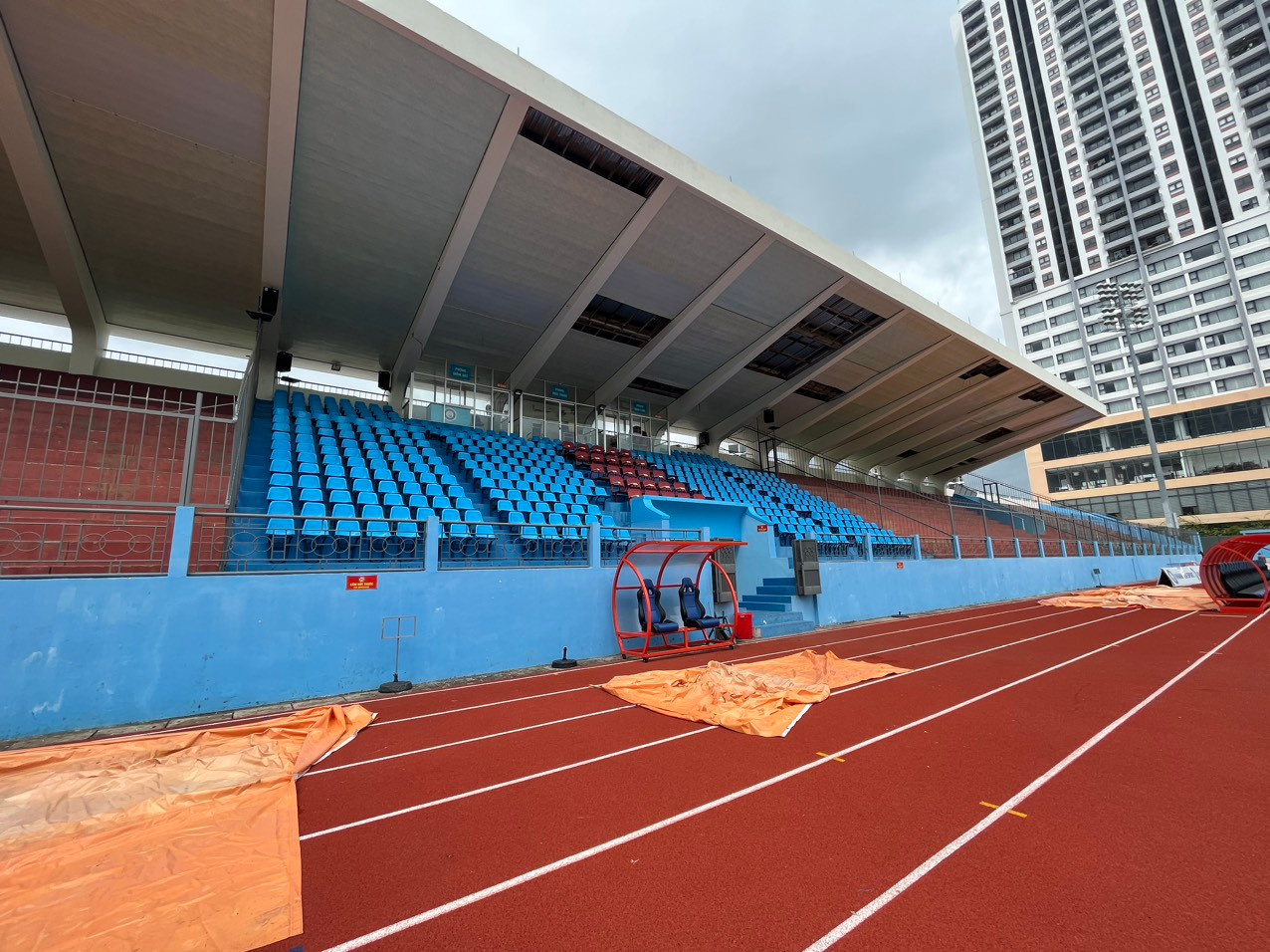 Theo lịch thi đấu V-League 2023, CLB Khánh Hòa sẽ có trận ra quân gặp CLB Thanh Hóa trên sân nhà lúc 17h chiều 3/2. Theo quan sát vào sáng 1/2 của PV, hiện đơn vị quản lý sân đã tổ chức cải tạo, dọn dẹp trong và bên ngoài sân vận động. Những tấm quảng cáo cũ được công nhân thay mới, dàn ghế, tường rào được sơn mới, quét dọn tươm tất. Tuy vậy, khán đài vẫn để lại nỗi lo cho khán giả khi một số tấm gỗ trên trần bị bong tróc, lộ ra những mảng nham nhở, thiếu mỹ quan và tiềm ẩn nguy hiểm.