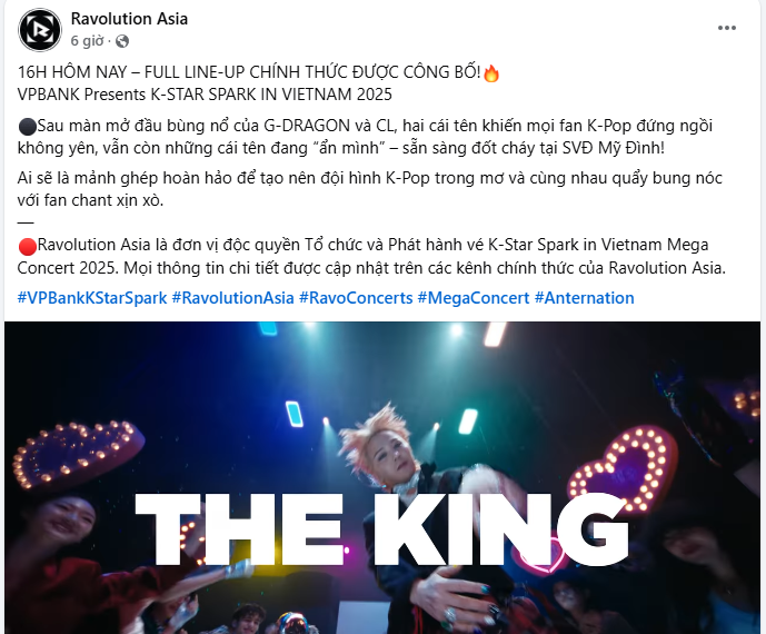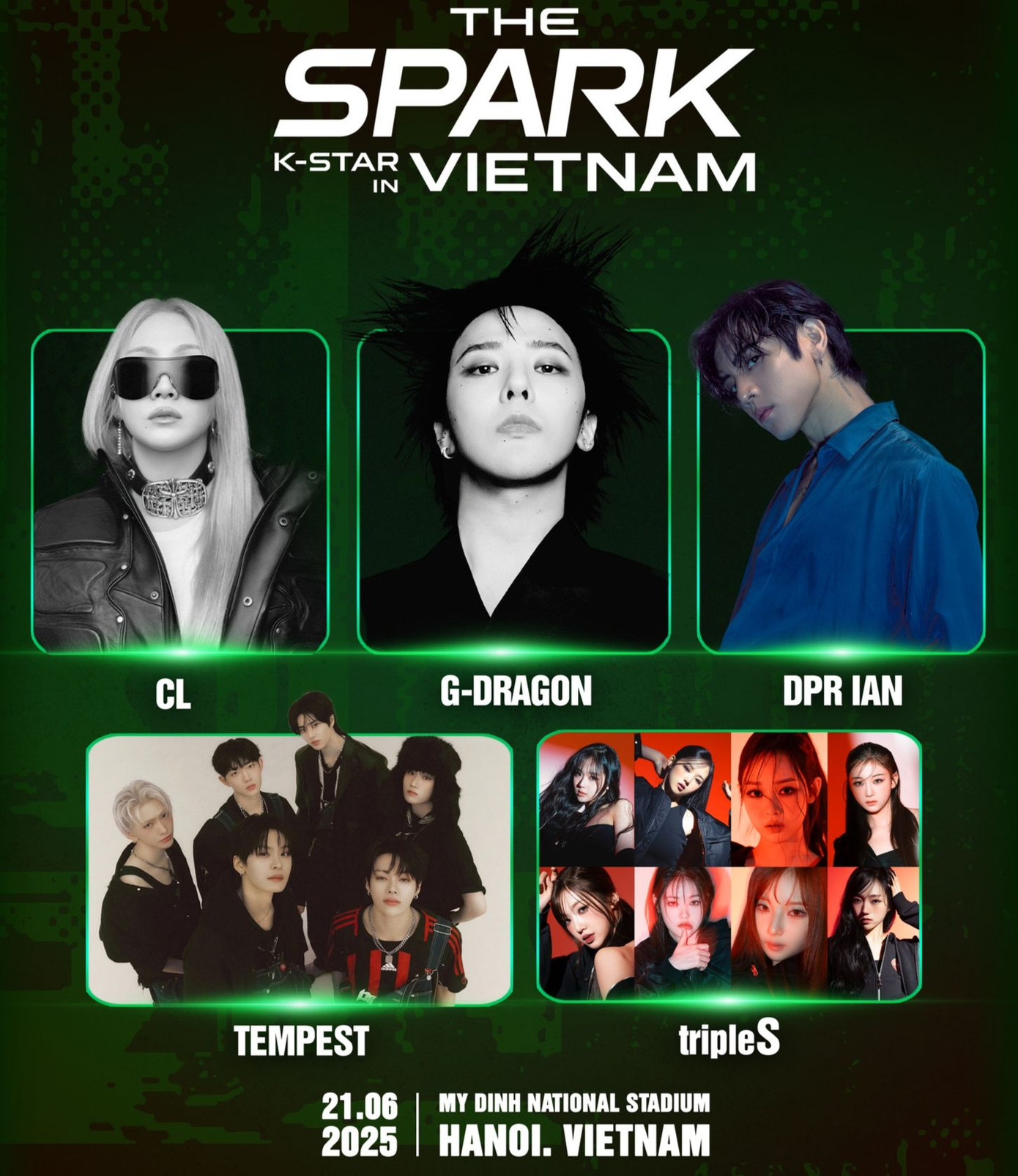 Sáng 13/5, ban tổ chức K-Star Spark in Vietnam Mega Concert 2025 xác nhận G-Dragon và CL là hai ngôi sao đầu tiên biểu diễn. Hẹn 16h chiều cùng ngày sẽ tiết lộ toàn bộ line-up nhưng đến giờ hẹn, toàn bộ các kênh SNS của sự kiện lại im ắng. Trong khi đó, hàng loạt fanpage giải trí lớn nhỏ tại Việt Nam đã công bố danh sách nghệ sĩ biểu diễn, có thêm "lãng tử" DPR IAN, TEMPEST và tripleS.
