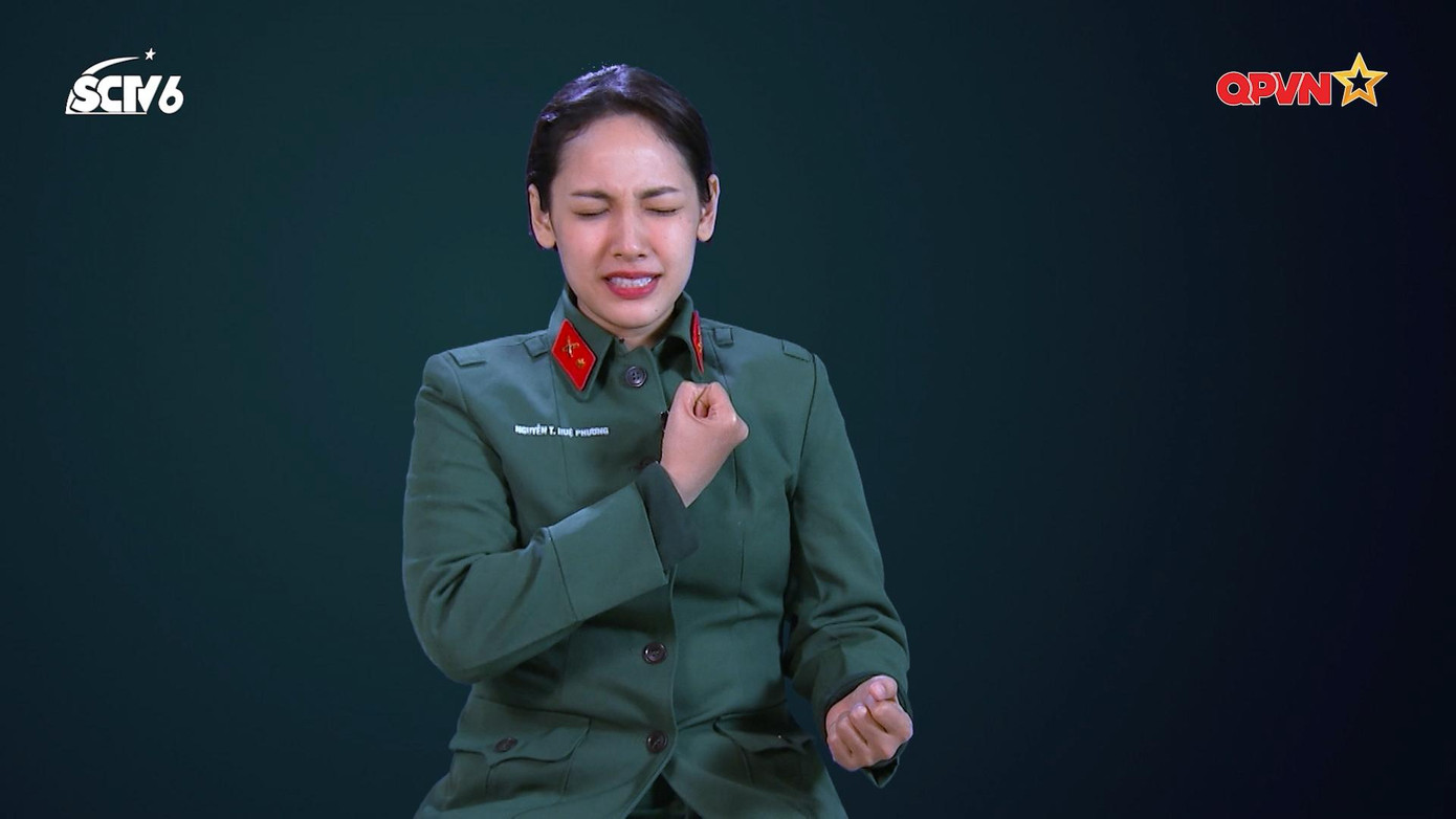Không ngừng làm khán giả mắt chữ A miệng chữ A, Trung đội trưởng đã trổ tài diễn catwalk và mở đầu là sự song hành với chính đồng chí Minh Tú.