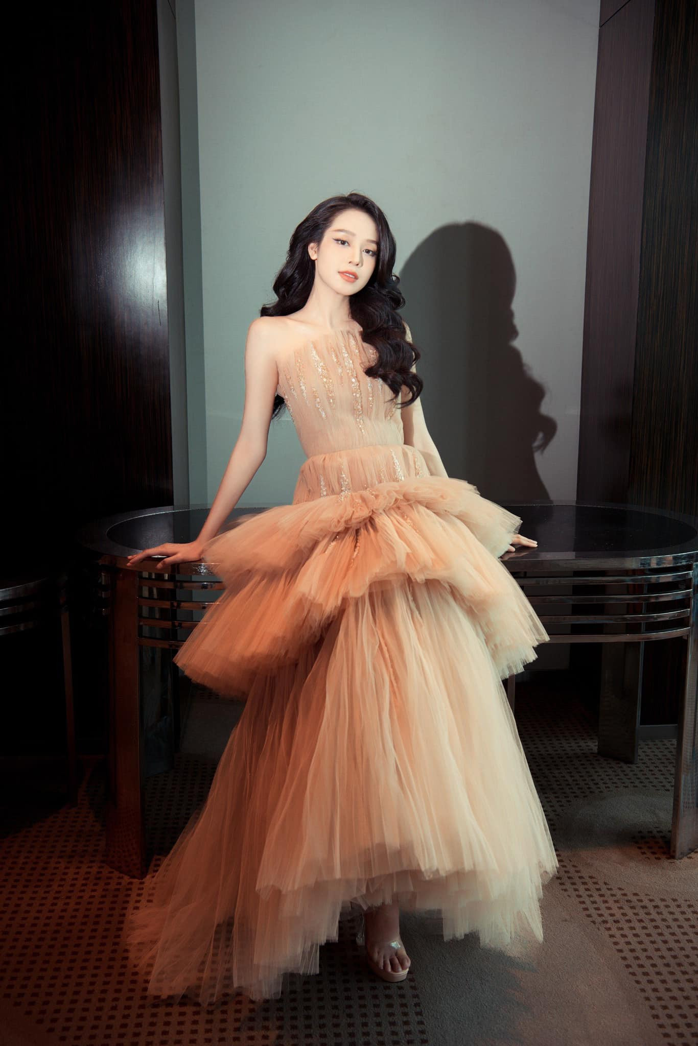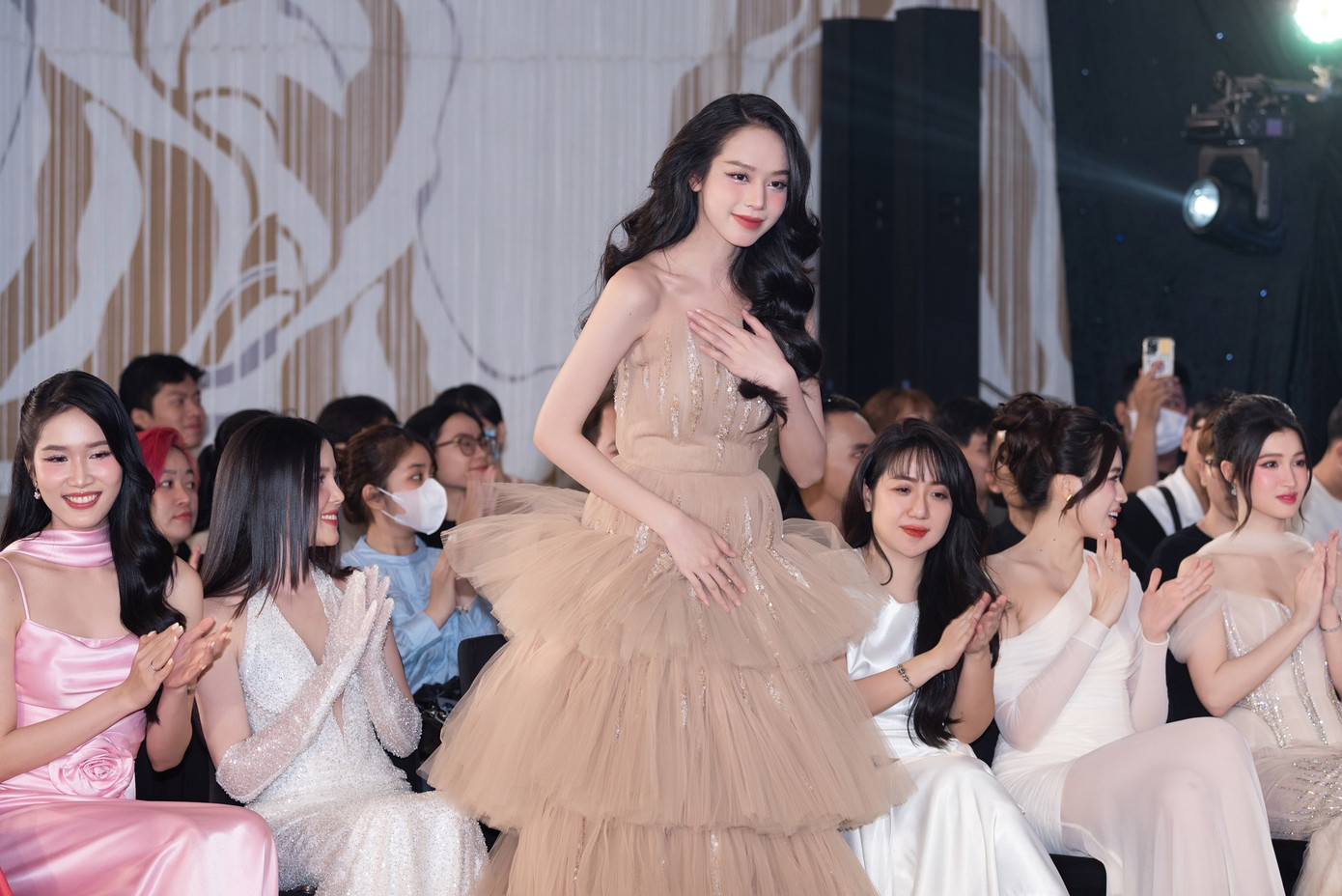 Ít ngày sau, Hoa hậu Thanh Thủy mặc mẫu đầm này trong lễ trao sash đại diện Việt Nam tại Miss World lần thứ 71. Sắc vóc của nàng hậu xứ Quảng trong thiết kế đầm màu be kết hợp với kiểu tóc xoăn sóng nhẹ nhận về nhiều lời khen.