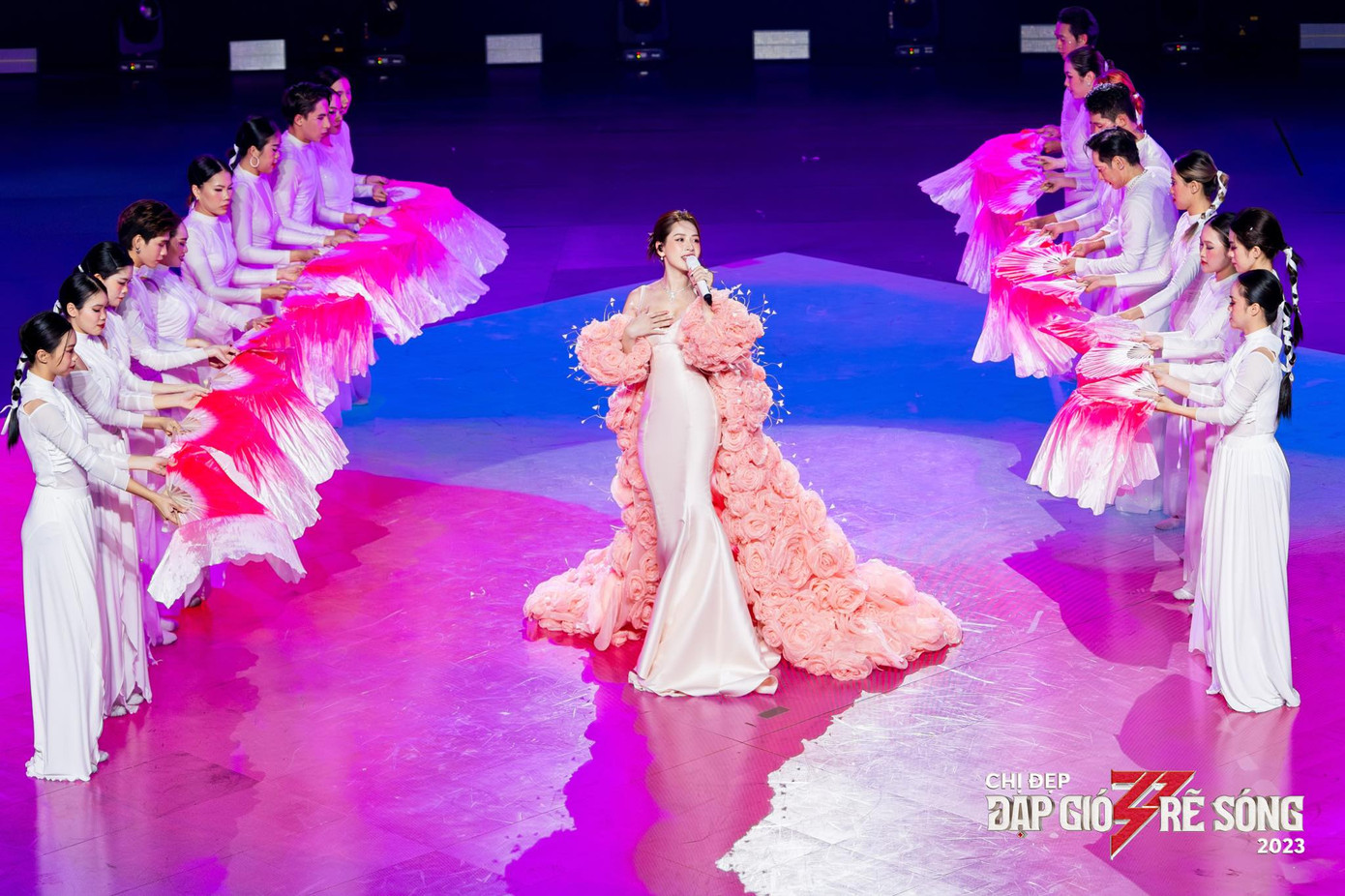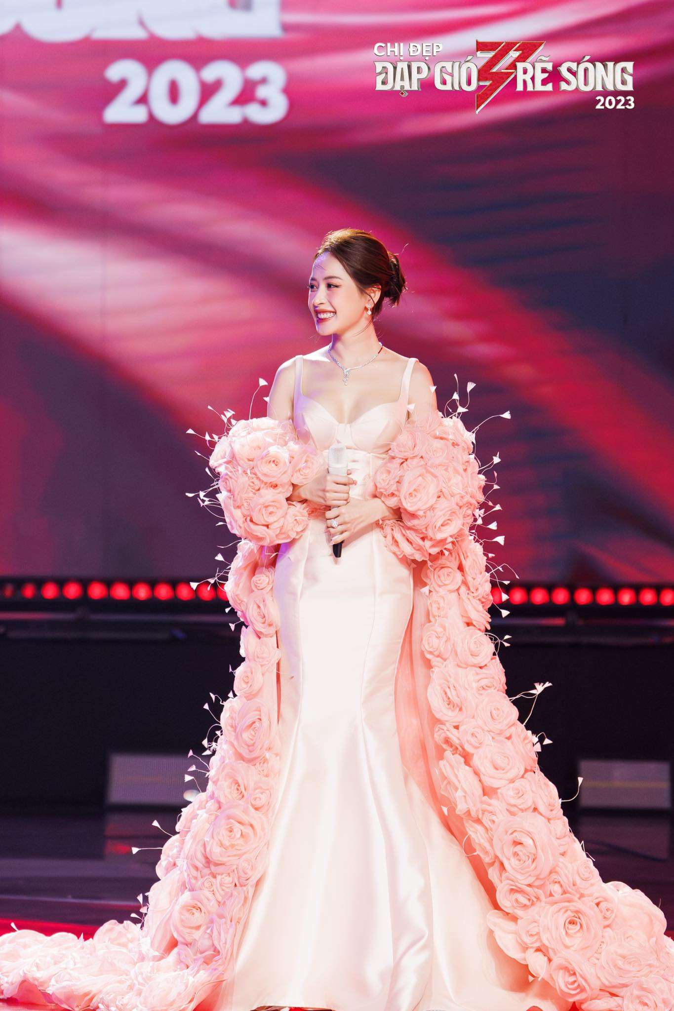 Chi Pu là khách mời trình diễn tại sân khấu Chung kết Chị Đẹp Đạp Gió Rẽ Sóng. Nữ ca sĩ xuất hiện ấn tượng trong thiết kế đầm đuôi cá với phần áo choàng hoa 3D đồ sộ. Người đẹp 30 tuổi hóa đóa hoa hồng, bừng sáng trên sân khấu, biểu diễn ca khúc Hoa Dưới Mặt Trời.