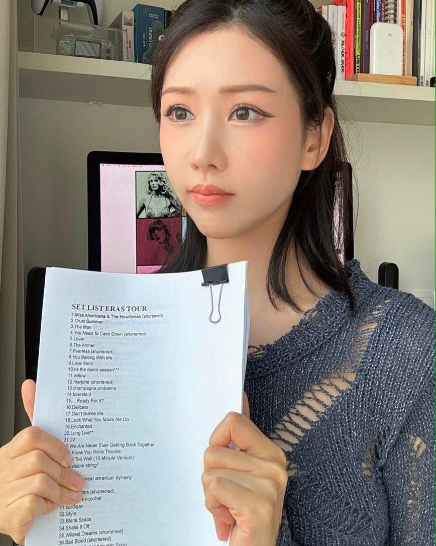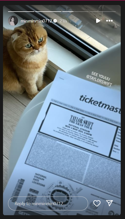 Nữ ca sĩ Min khiến người hâm mộ thích thú khi chuẩn bị "phao" - một tập lời bài hát để đi đu thần tượng. Ngày 3/3, cô nàng hé lộ trên story Instagram về việc chuẩn bị khởi hành sang Singapore tham dự The Eras Tour.