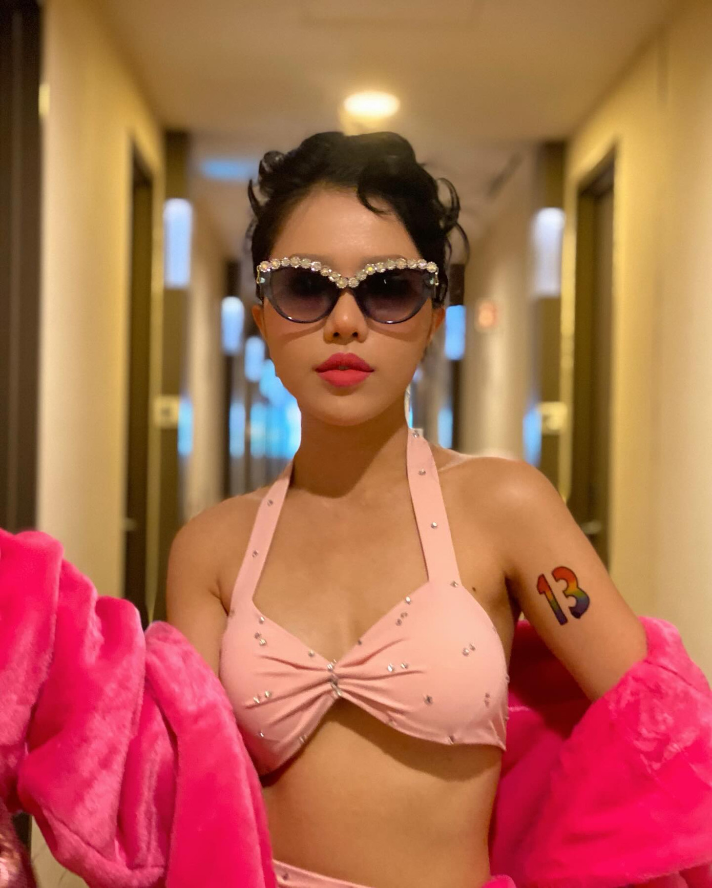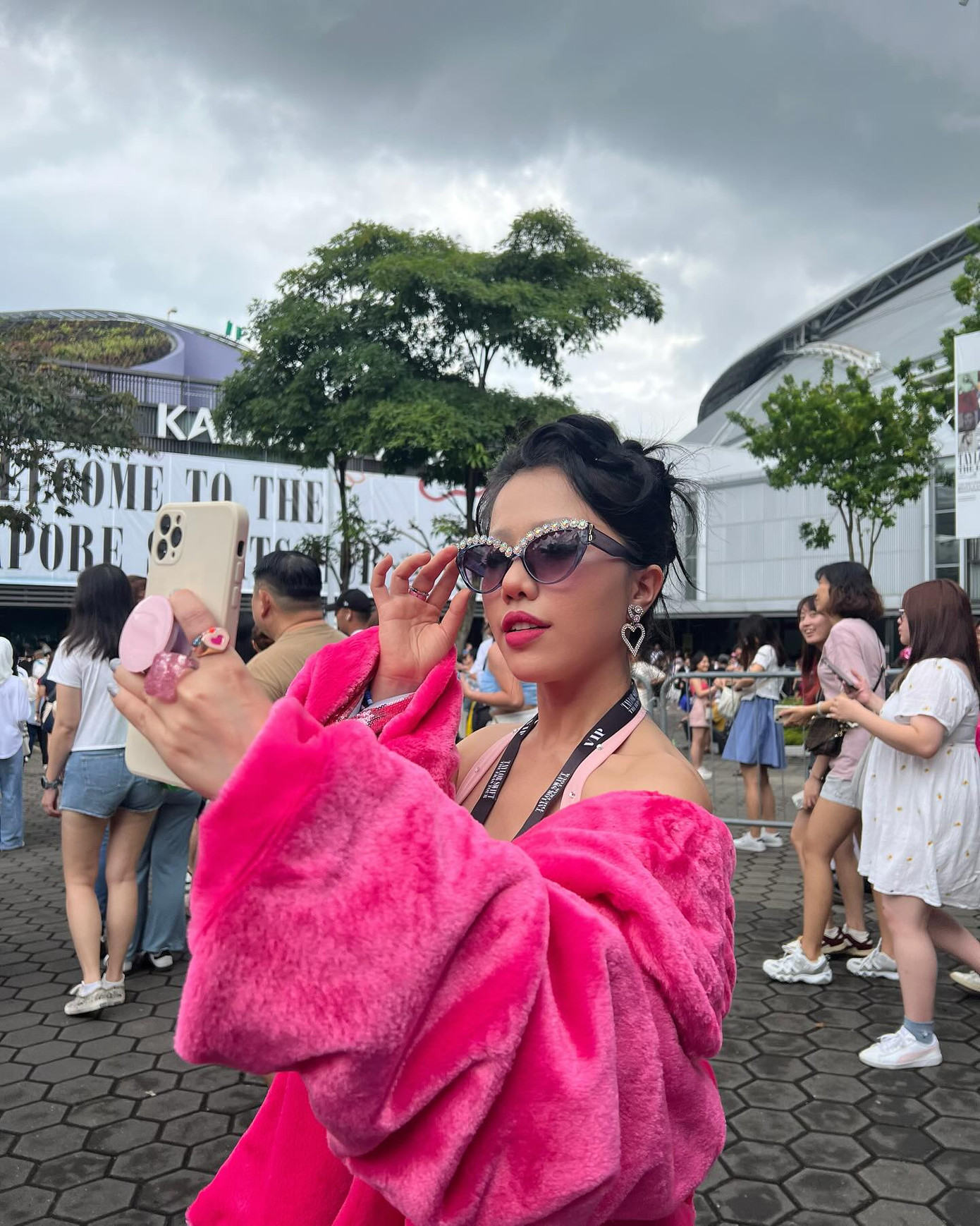 Phùng Khánh Linh thu hút ánh nhìn tại sân vận động với trang phục nguyên cây hồng. Cô nàng xứng danh Swifties cứng với diện mạo được lấy cảm hứng từ kỷ nguyên Lovers. Chi tiết con số 13 ở cánh tay cũng kính mát đính đá tạo điểm nhấn, hoàn thiện tạo hình "cực cháy". Khánh Linh cũng khiến netizen trầm trồ khi chịu chơi diện áo lông giữa thời tiết gần 30 độ nóng ẩm ở Singapore.