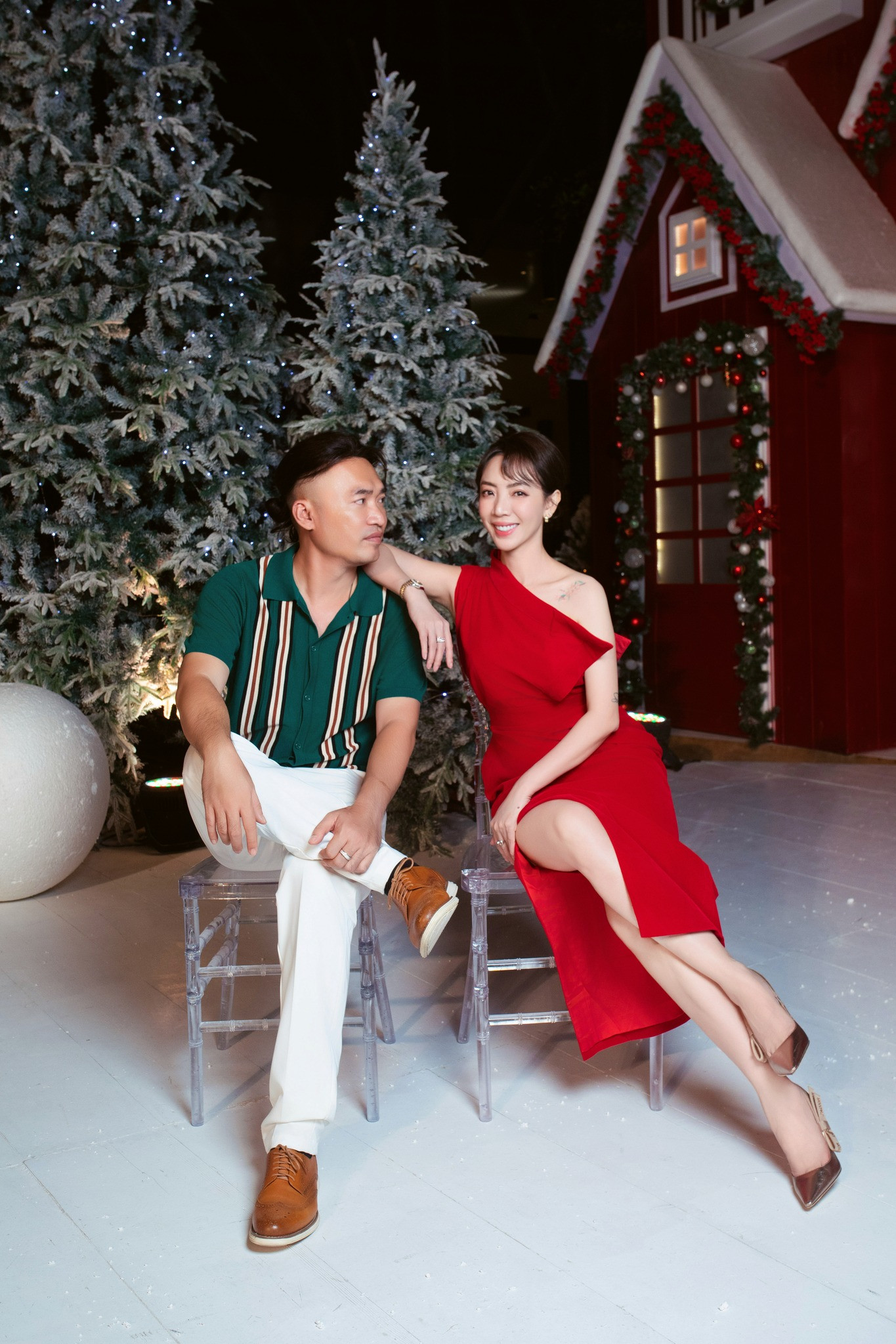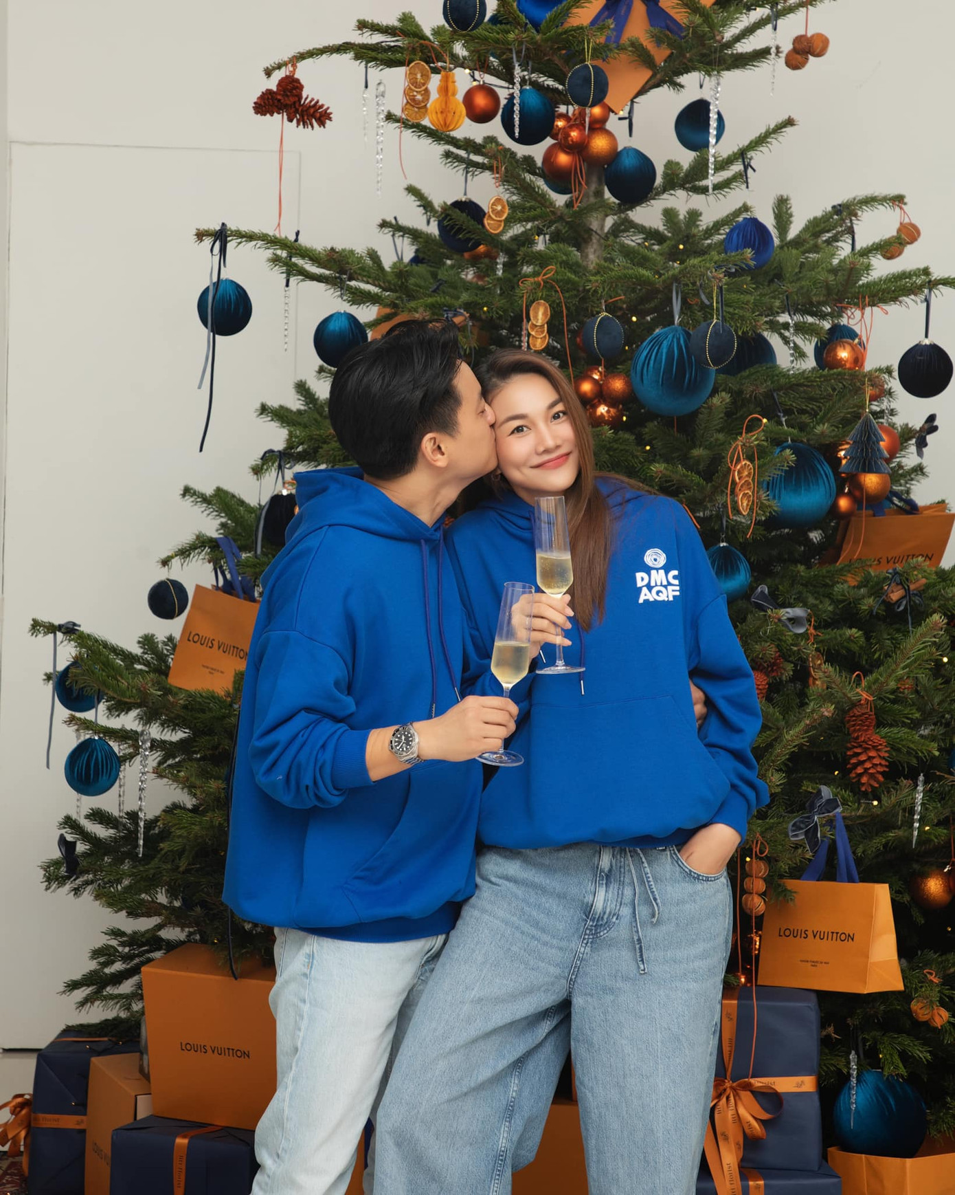 Siêu mẫu Thanh Hằng cùng chồng diện đồ đôi năng động trong dịp Giáng sinh. Thiết kế cây thông treo đầy túi hàng hiệu của nữ siêu mẫu gây chú ý.