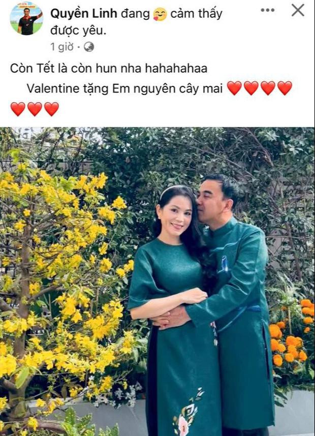 MC Quyền Linh nổi tiếng là một người đàn ông của gia đình. Mới đây, anh đã đăng tải hình ảnh tận hưởng ngày Valentine cùng bà xã Dạ Thảo. Cả hai đã có gần 2 thập kỷ chung sống bên nhau. Trong bài đăng của mình, nam MC viết: "Còn Tết là còn hun nha. Valentine tặng em nguyên cây mai" cùng hình ảnh tình tứ bên bà xã.