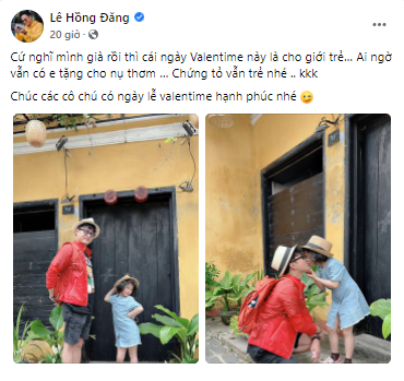 Nếu như ngày Valentine ai nấy đều khoe ảnh người yêu, bạn gái và vợ thì diễn viên Hồng Đăng lại khoe con gái. Mới đây, anh đăng tải trên trang cá nhân bức ảnh tạo dáng nhí nhảnh bên bé Kẹo và viết: "Cứ nghĩ mình già rồi thì cái ngày Valentine này là cho giới trẻ… Ai ngờ vẫn có em tặng cho nụ thơm… Chứng tỏ vẫn trẻ nhé. Chúc các cô chú có ngày lễ Valentine hạnh phúc nhé".