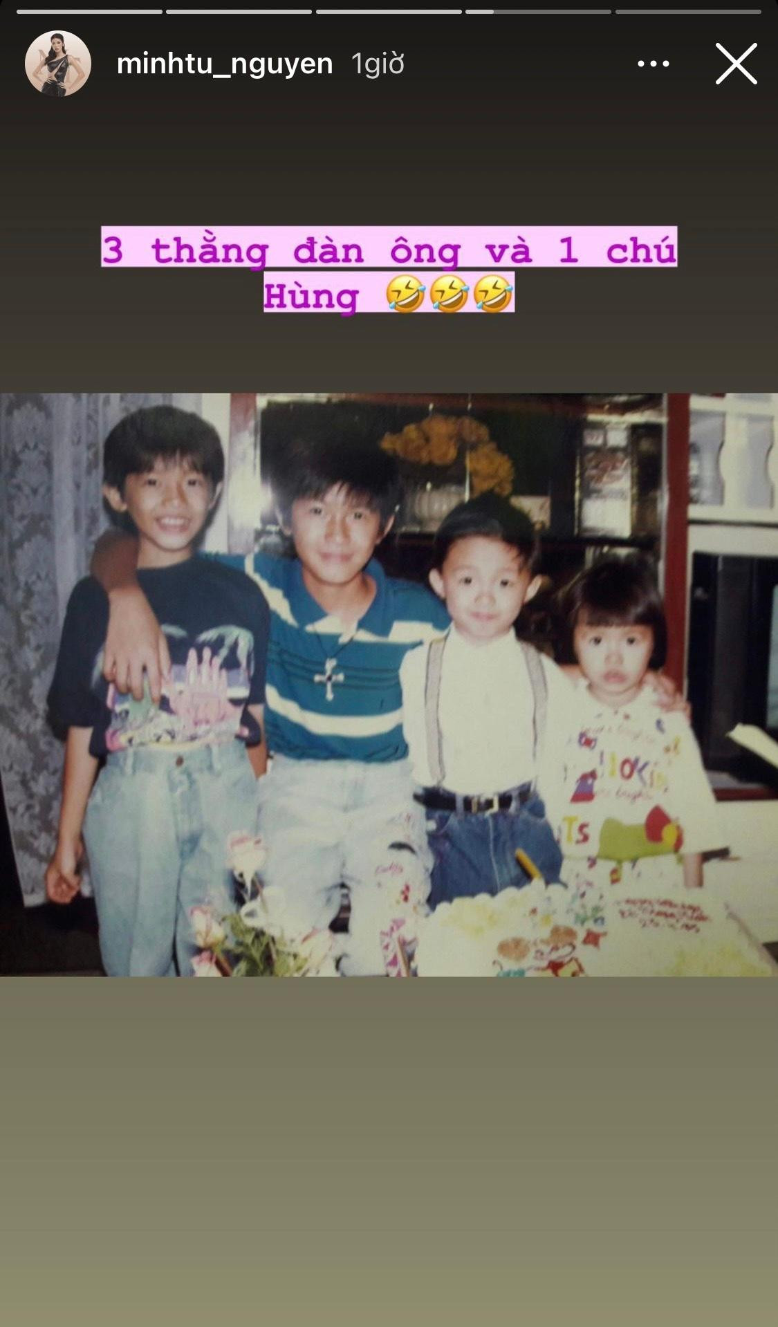 Trên Instagram cá nhân, Minh Tú khiến cư dân mạng thích thú với loạt ảnh ngày xưa của mình. Theo đó, nữ siêu mẫu tạo dáng cool ngầu với style "đầu trái dừa", mắt kính đen và biểu cảm "khó đỡ". Ngoài ra, "Thúy Liễu" cũng khoe khoảnh khắc chụp cùng các anh trai kèm theo dòng trạng thái dí dỏm "3 thằng đàn ông và một chú Hùng".