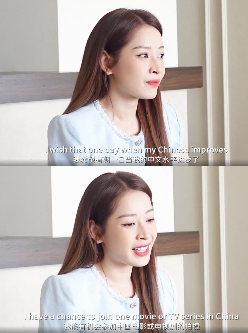 "My dream is I can join the film industry in China. I wish that one day when my Chinese improve, I have a chance to join one movie or TV series in China". (PV tạm dịch: Ước mơ của tôi là có thể tham gia vào lĩnh vực điện ảnh ở Trung Quốc. Tôi mong rằng khi tiếng Trung của tôi khá hơn, tôi sẽ có cơ hội tham gia một bộ phim điện ảnh hoặc phim truyền hình Trung Quốc).
