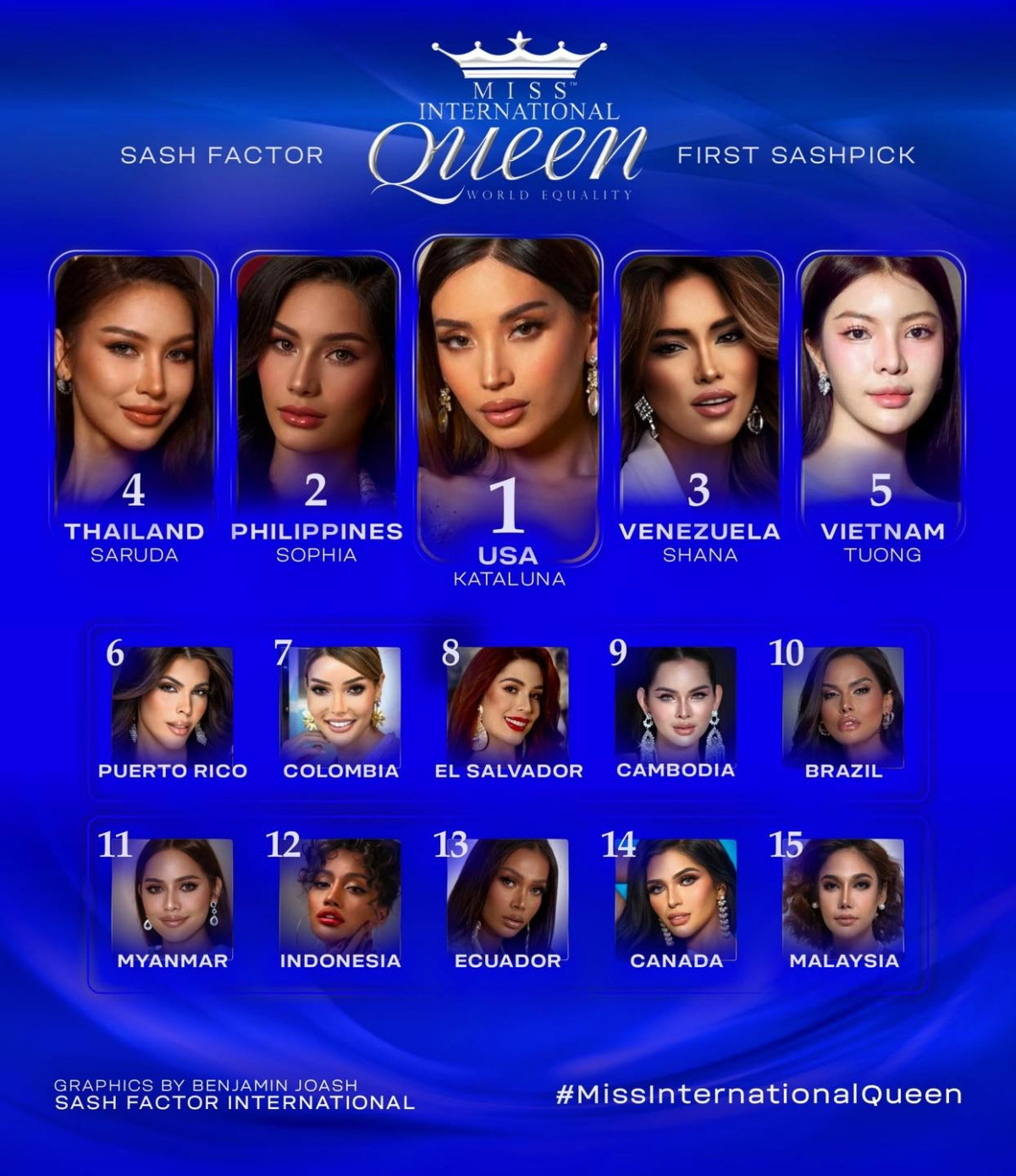 Chuyên trang nhan sắc quốc tế Sash Factor dự đoán đại diện Việt Nam sẽ lọt Top 5 chung cuộc ở vị trí thứ 5. Đại diện Mỹ được dự đoán giành vương miện.