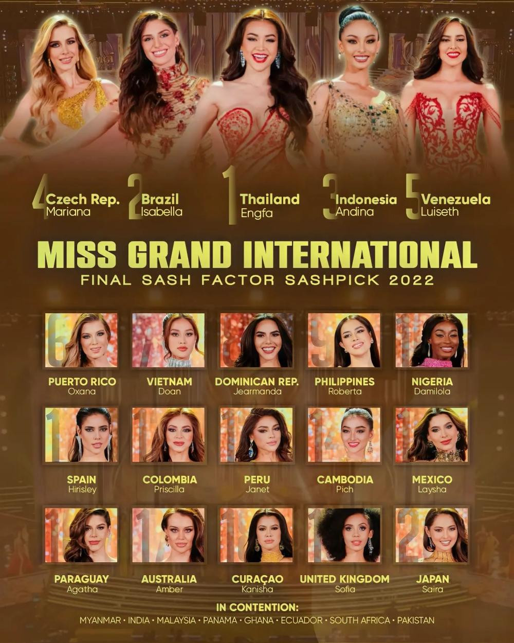 Sau đêm thi Bán kết Miss Grand International (Hoa hậu Hòa bình Quốc tế) 2022, Hoa hậu Thiên Ân được chuyên trang Sash Factor dự đoán lọt Top 20 tất cả các vòng thi phụ.