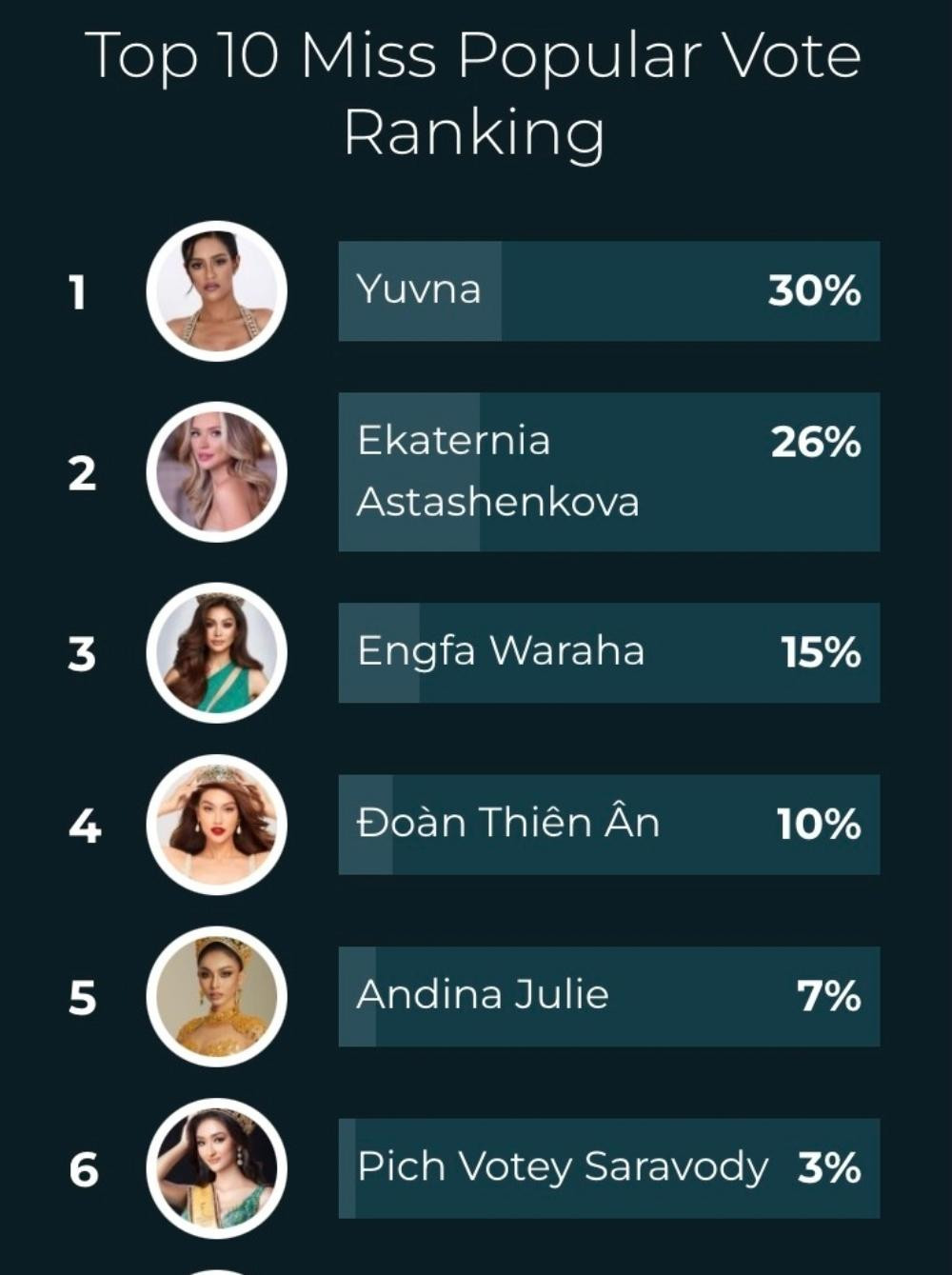 Ở một bảng bình chọn khác có lợi thế hơn, người đẹp giành chiến thắng sẽ vào thẳng Top 10 là Miss Popular Vote, Hoa hậu Thiên Ân hiện đang ở tận vị trí thứ 4.