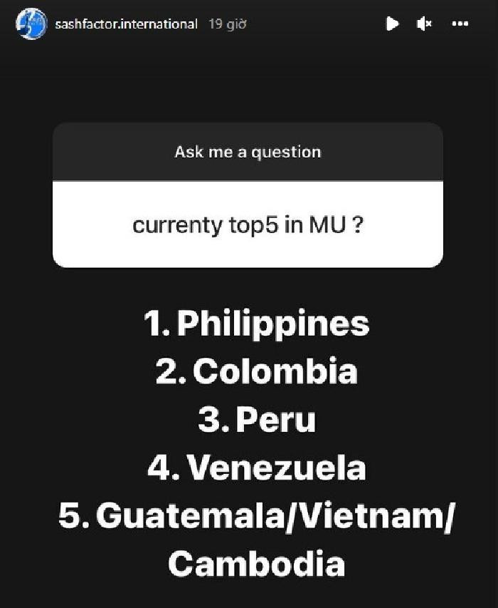 Trả lời cho câu hỏi “Những đại diện xứng đáng lọt Top 5 của Miss Universe hiện tại?” - Sash Factor đã đặt Việt Nam có thể đứng ở vị trí thứ 5.