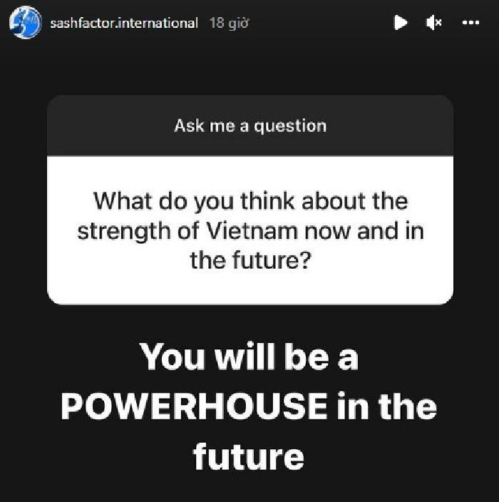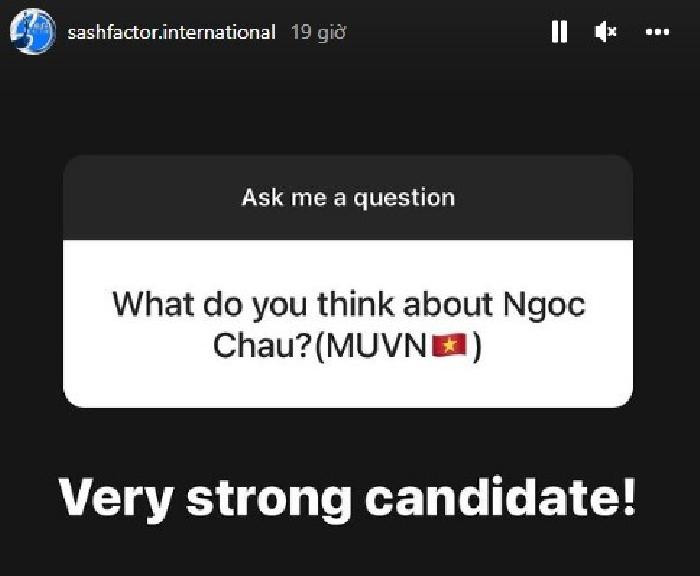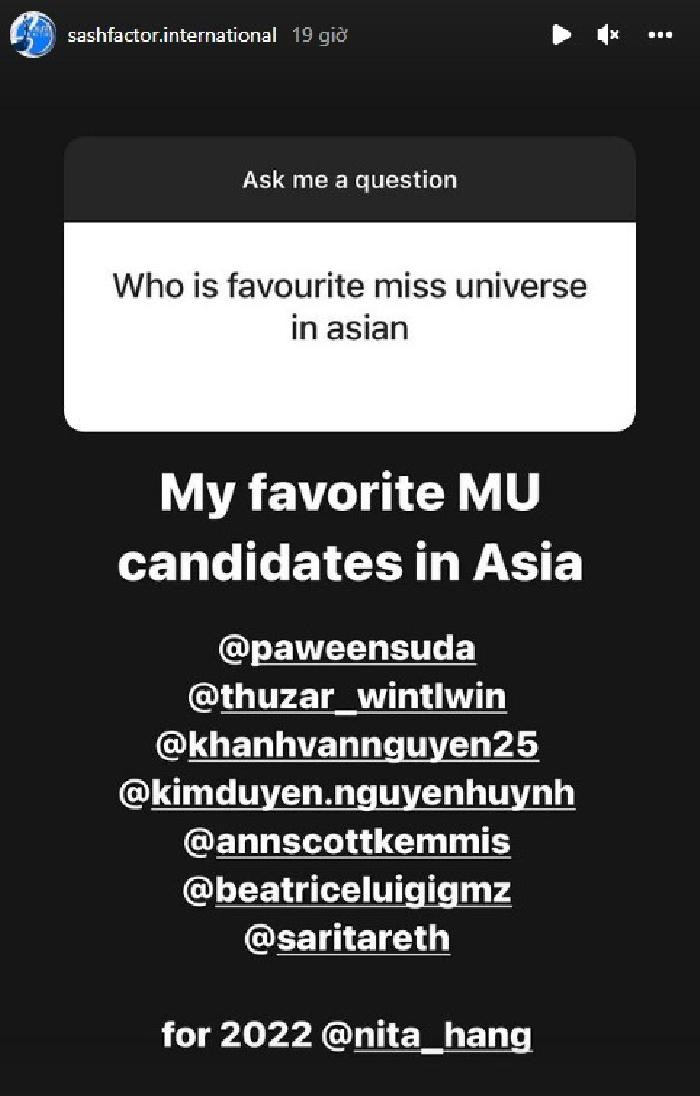 Khi được hỏi: “Bạn nghĩ gì về Thao Nhi Le (Á hậu 1 của Miss Universe Vietnam 2022), người sẽ tham gia Miss Universe 2023?”. Sash Factor cho rằng Thao Nhi Le sẽ tiếp tục ghi dấu ấn cho Việt Nam tại đấu trường này.