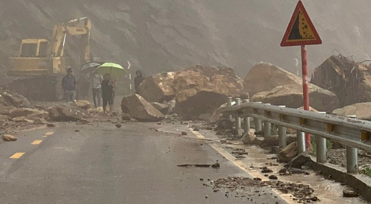 | Khoảng 80m3 đất đá sạt lở đổ ập xuống đường. |