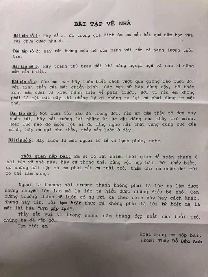 Ngoài nội dung 6 bài tập về nhà, thầy Đức Anh đã ẩn ý thông điệp khi yêu cầu thời gian nộp bài: "Em sẽ có rất nhiều thời gian để hoàn thành 6 bài tập về nhà này, hãy cứ thong thả, đừng vội nộp bài. Bởi thầy biết, có những bài tập mà em phải mất cả tuổi trẻ, thậm chí cả cuộc đời mới có thể làm xong.