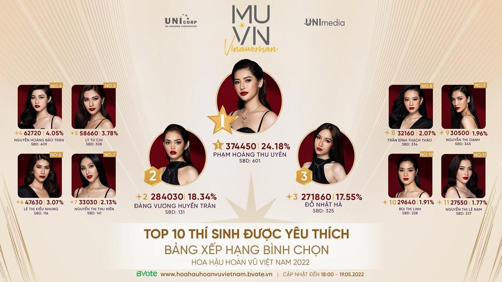 Sau đó, giống như format Miss Universe 2021 vừa qua, sẽ là Top 16 chung cuộc, trong đó có 1 thí sinh sẽ được vào thẳng nhờ bình chọn. Hiện tại, tính đến hết ngày 19/05, Phạm Hoàng Thu Uyên, cô gái được ví như “Suzy phiên bản Việt", một lần nữa lại vượt lên các người đẹp khác, trở thành thí sinh được bình chọn nhiều nhất. Hoa hậu chuyển giới Đỗ Nhật Hà hiện đang ở vị trí thứ 3.