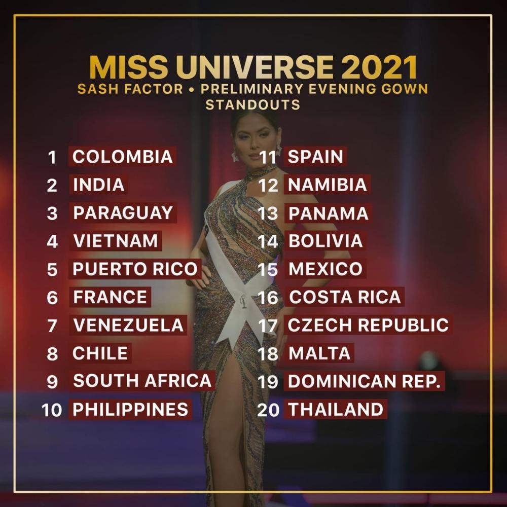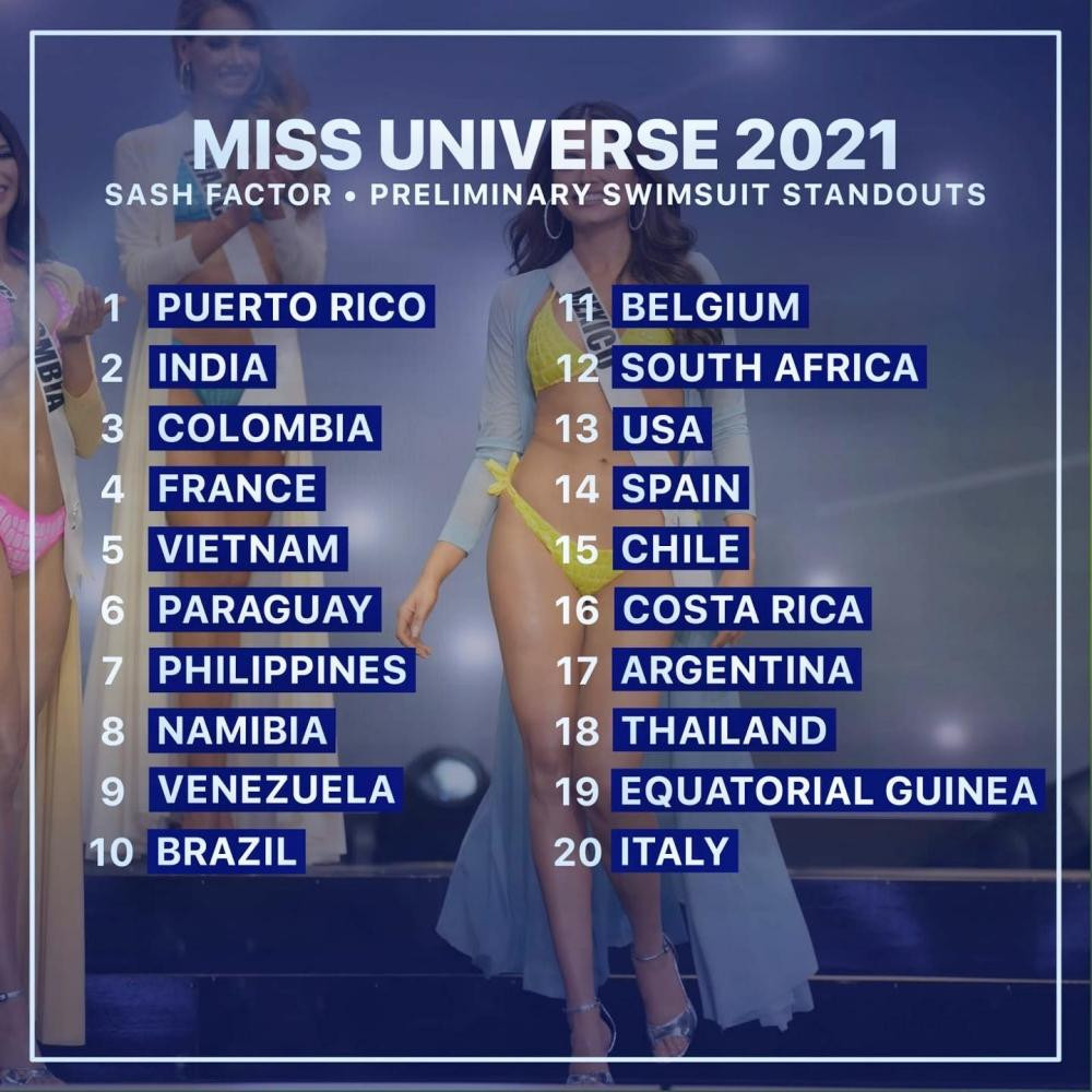 Mới đây, chuyên trang sắc đẹp Sash Factor đã đưa ra BXH Top 20 của Miss Universe năm nay theo đánh giá của họ sau đêm Bán kết. Theo đó, ở cả hai BXH Top 20 trang phục dạ hội và áo tắm đều chỉ có 3 đại diện của Đông Nam Á xuất hiện.