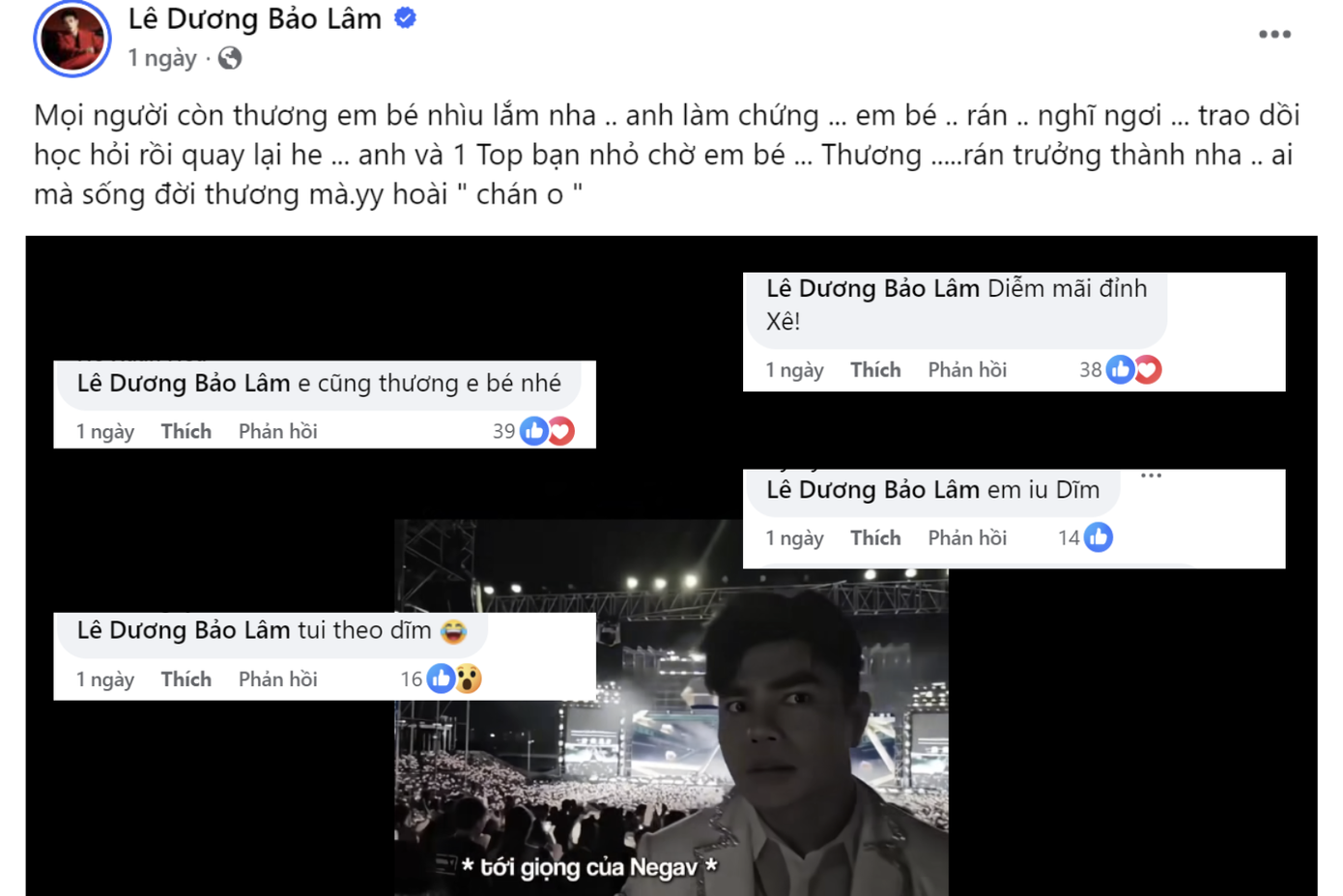 Sau concert D-2, Lê Dương Bảo Lâm tiếp tục thu hút sự chú ý khi đăng tải trên trang cá nhân bài viết: "Mọi người còn thương bé nhiều lắm nha", kèm theo video tổng hợp những khoảnh khắc của NEGAV. Bài viết này nhanh chóng trở thành đề tài bàn tán trên mạng xã hội, khi nhiều người nhận định đó là sự thể hiện tình yêu thương mà Lê Dương Bảo Lâm dành cho đàn em trong nghề, giữa lúc NEGAV đang đối diện với tâm bão dư luận.