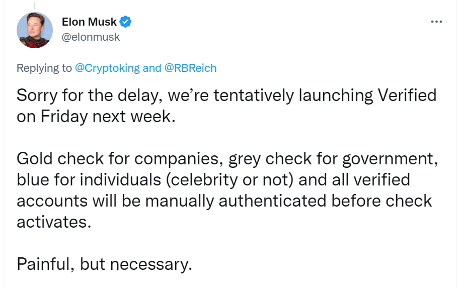Thông tin này đã được hé lộ trước đó, nhưng đến bây giờ Musk mới xác nhận chi tiết về sự thay đổi này. Ông cũng cho biết tất cả các tài khoản đã được xác minh sẽ được “xác thực thủ công” lại lần nữa, nhưng lại không nói gì về việc có tính phí cho bất kỳ dấu tick mới nào hay không.