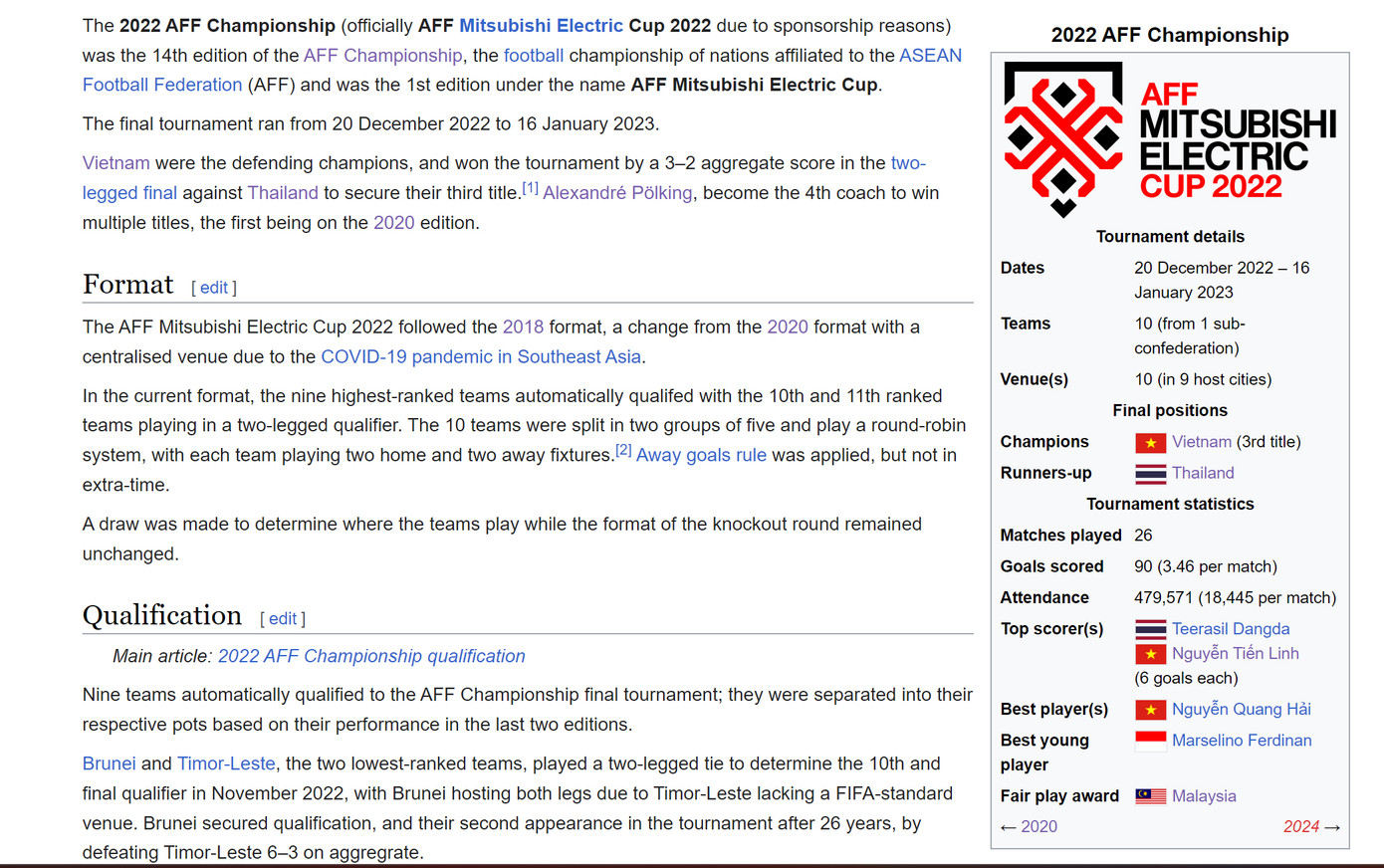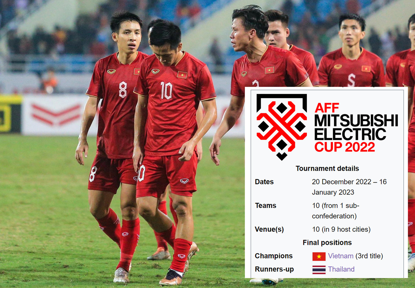 Có vẻ vẫn không cam tâm sau thất bại của ĐT Việt Nam ở chung kết AFF Cup 2022, một ai đó đã chỉnh sửa toàn diện thông tin về AFF Cup 2022 phiên bản tiếng Anh trên trang Wikipedia. Theo đó, trận chung kết lượt về AFF Cup 2022 thay vì kết thúc với tỷ số 0-1 nghiêng về Thái Lan, kết quả biến thành 1-0 cho Việt Nam và người ghi bàn là Nguyễn Quang Hải.