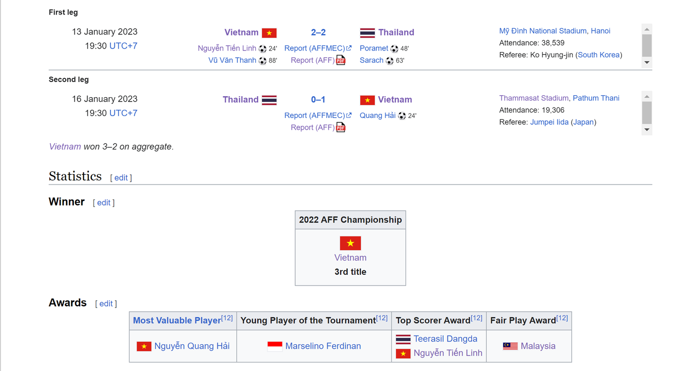 Với tỷ số này, đương nhiên Việt Nam là nhà vô địch AFF Cup 2022. Đồng thời, danh mục Cầu thủ xuất sắc nhất giải cũng được sửa thành Nguyễn Quang Hải. Trên thực tế, người nhận giải thưởng này là Theerathon Bunmathan. Phong độ của đội trưởng ĐT Thái Lan đối nghịch với Quang Hải, cầu thủ đã có một giải đấu mờ nhạt và mất suất đá chính ở trận chung kết lượt về. Nhân tiện, thông tin chỉnh sửa trên Wikipedia ghi Quang Hải có bàn thắng phút 24 tại sân Thammasat, trong khi anh chỉ được vào sân phút 36.