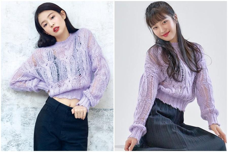 Khi chụp ảnh tạp chí, hai cô gái có lần cùng diện mẫu áo len tím nhạt. Jennie đầy táo bạo khi để lộ vòng eo thon còn Joy lại ngọt ngào dịu dàng khi kết hợp với chân váy xòe.