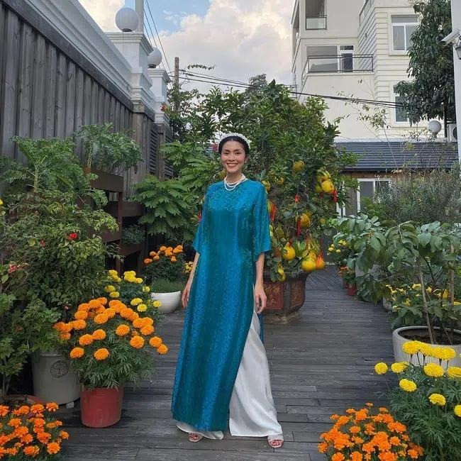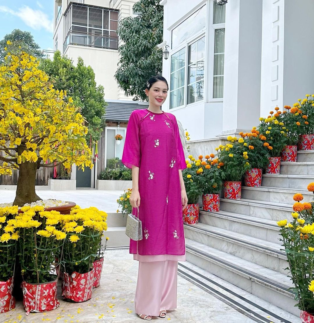 Ngay cả áo dài Tết của Linh Rin cũng có dáng suông với tông màu nổi bật, trùng hợp với kiểu áo dài mà Tăng Thanh Hà mặc suốt nhiều năm qua.