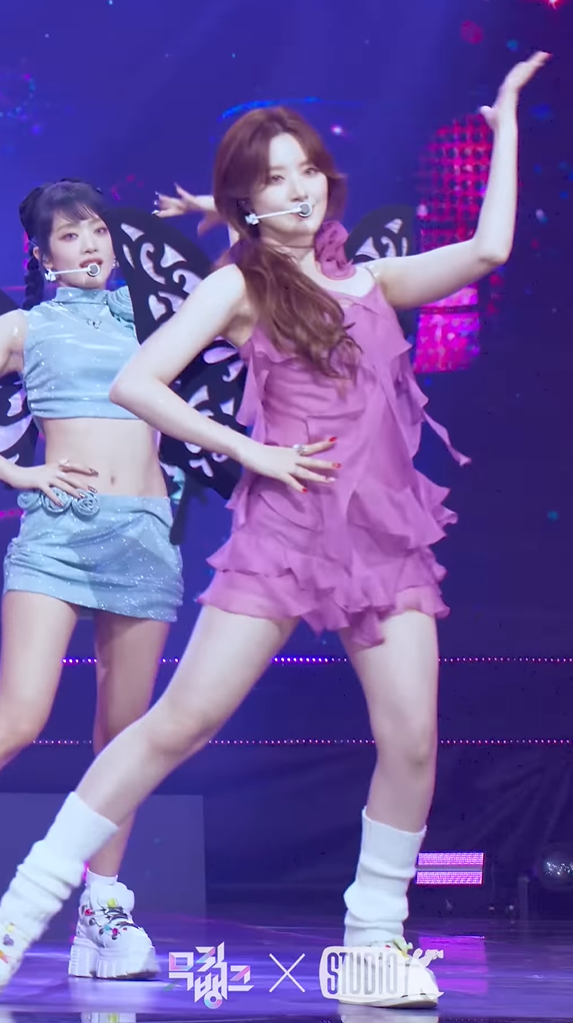 Cách đây 1 tuần, Shuhua từng diện mẫu váy này trong sân khấu Queencard trên Music Bank và tham gia một fansign. Shuhua gần như mặc nguyên bản so với thiết kế gốc. Stylist của em út (G)I-DLE đã biến bông hoa đính ở dây váy thành choker, phối với giày thể thao và tất ống chân.