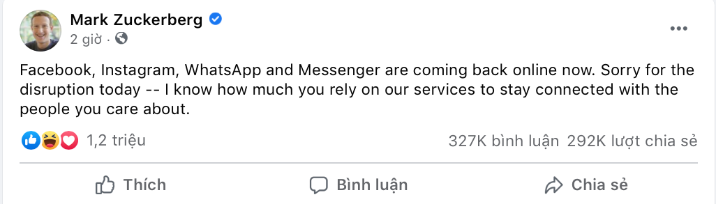 Theo ghi nhận vào khoảng 6h sáng nay, Facebook đã có thể truy cập trở lại ở Việt Nam, Messenger cũng đã hoạt động trở lại. Nhà sáng lập Facebook mới đây đã có bài đăng đề cập tới sự cố này và cho biết mọi thứ đã được khôi phục trở lại. Việc Facebook lỗi toàn thế giới trong nhiều giờ đồng hồ cũng đã làm cho tài sản của Mark bốc hơi hơn 7 tỉ USD, tổng tài sản của anh bị rớt xuống vị trí thứ 5 trong danh sách những người giàu nhất thế giới.