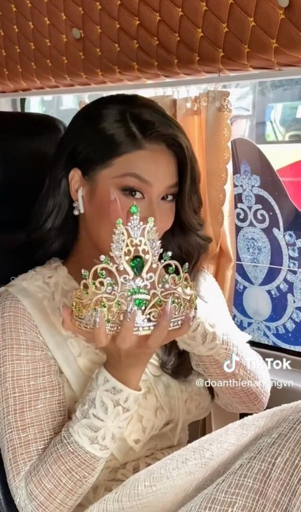 | Nàng hậu khoe tin vui vương miện đã được mang đi sửa. |