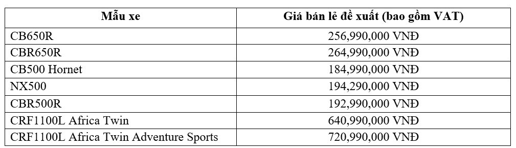 Giá bán lẻ đề xuất của các mẫu xe phân khối lớn trên được công bố như sau: