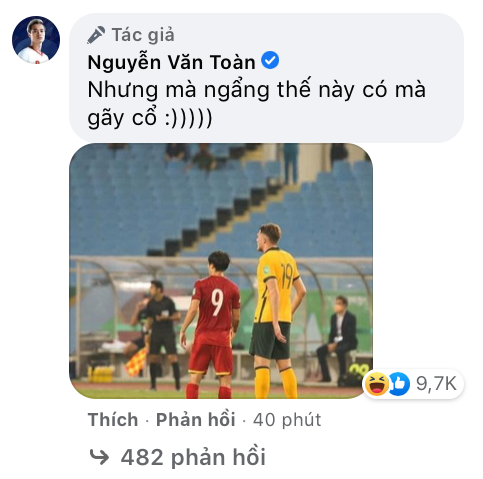 Đáng chú ý, dưới phần bình luận, Văn Toàn lại khiến người hâm mộ không thể nhịn cười khi tự tay đăng tấm ảnh anh đứng cạnh nam cầu thủ số 19 của ĐT Australia. Có thể thấy cầu thủ đội bạn cao hơn Văn Toàn cả một cái đầu, do đó anh không ngần ngại mà thừa nhận "sự thật" đau lòng: "Nhưng mà ngẩng thế này thì có mà gãy cổ".