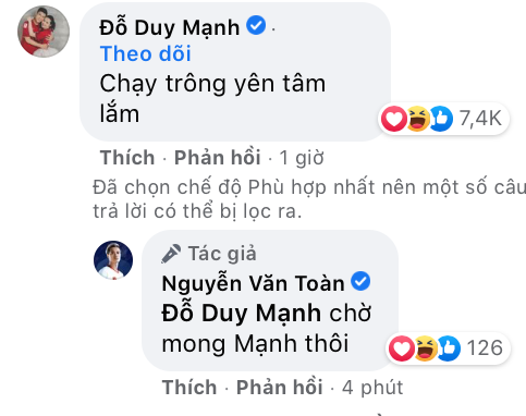 Dưới bài đăng của Văn Toàn, rất nhiều đồng đội cũng như người hâm mộ để lại bình luận động viên, khích lệ tinh thần. Bên cạnh đó, cũng không thiếu những bình luận "dìm hàng" nam cầu thủ số 9 không thương tiếc.