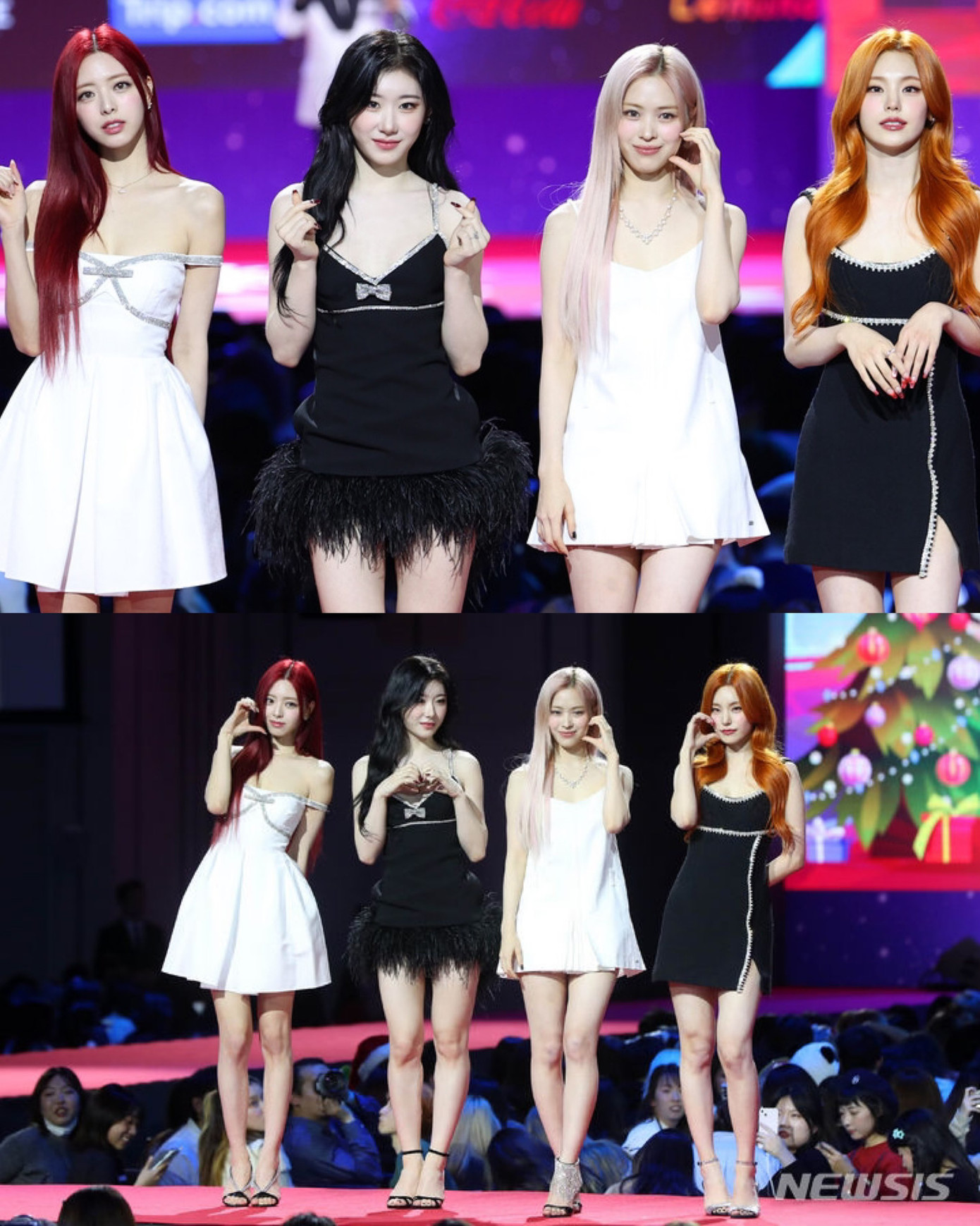 Một trong những cái tên đang lọt top tìm kiếm của dàn sao nữ là LE SSERAFIM. Nhóm quyến rũ, sang trọng trong những chiếc đầm ôm body đen, tạo điểm nhấn bằng phụ kiện như ruy băng, khuyên tai... đỏ.