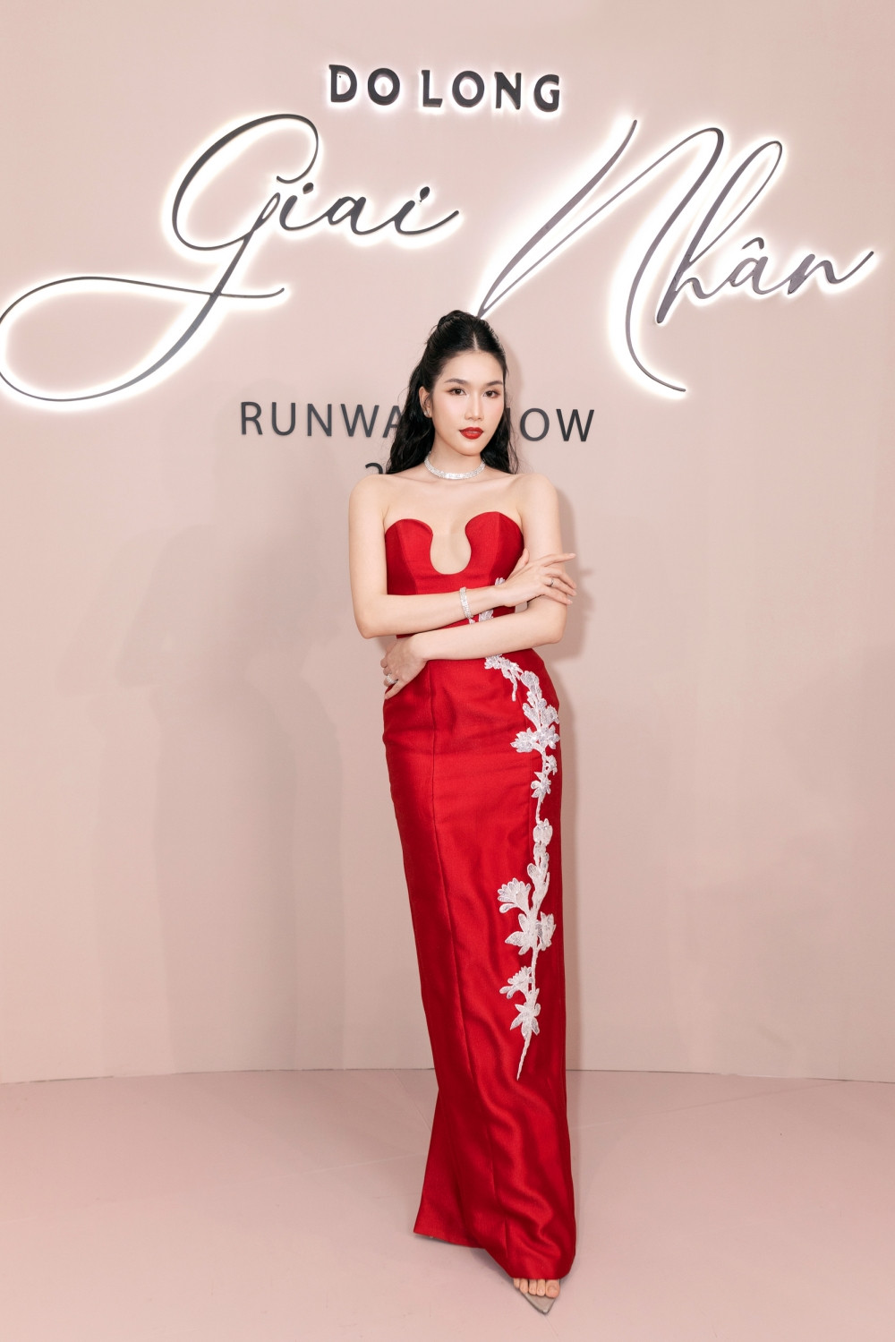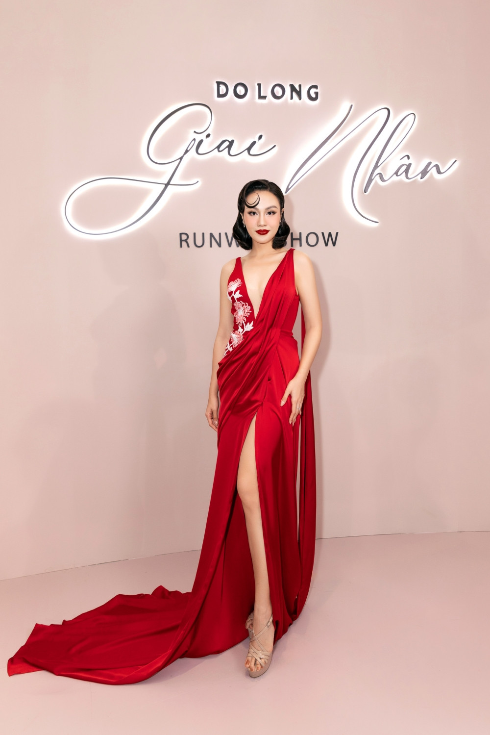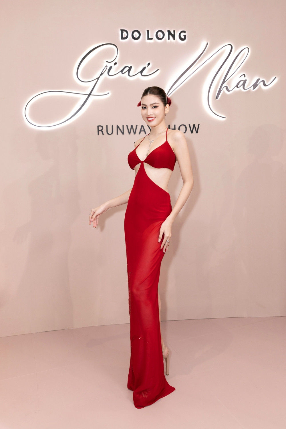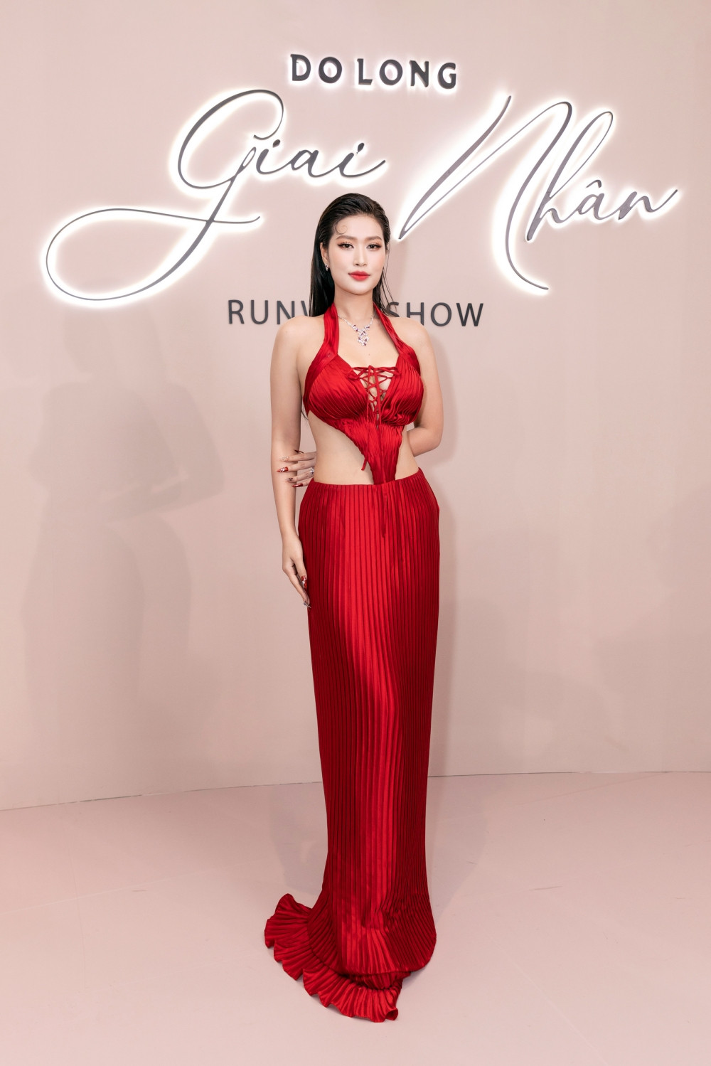 Hoa hậu Đoàn Thiên Ân là một trong những người bạn thân thiết của NTK Đỗ Long. Cô ghi điểm bởi set đồ mang tông đỏ có điểm nhấn dập ly.