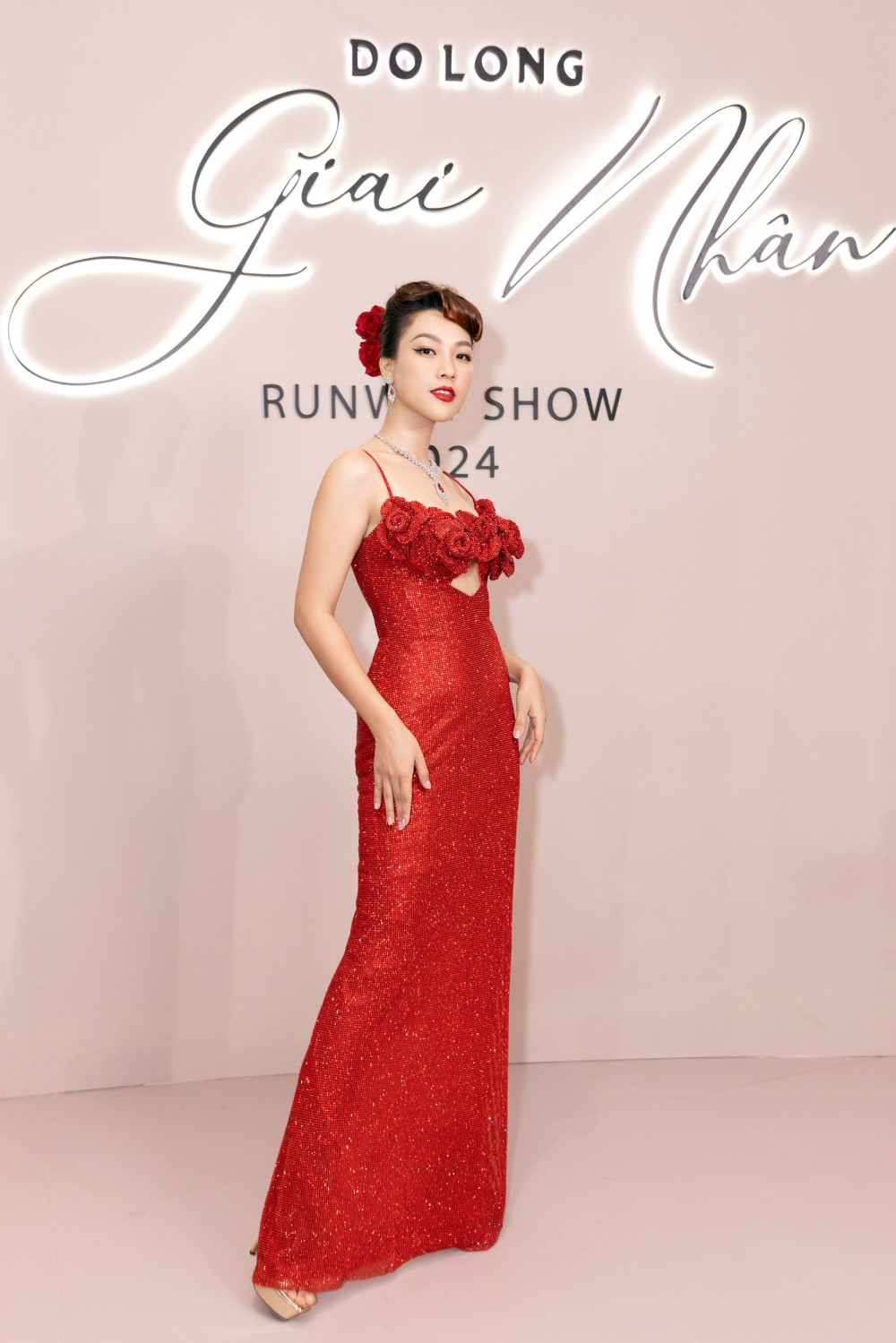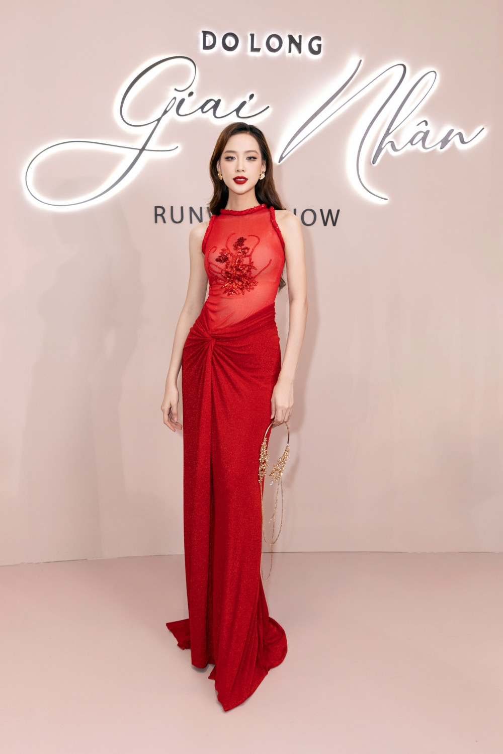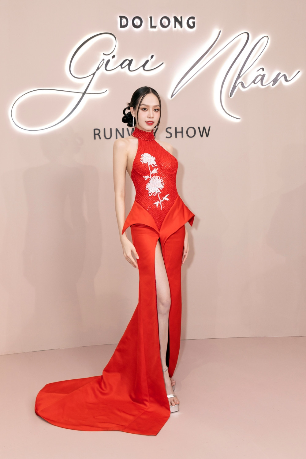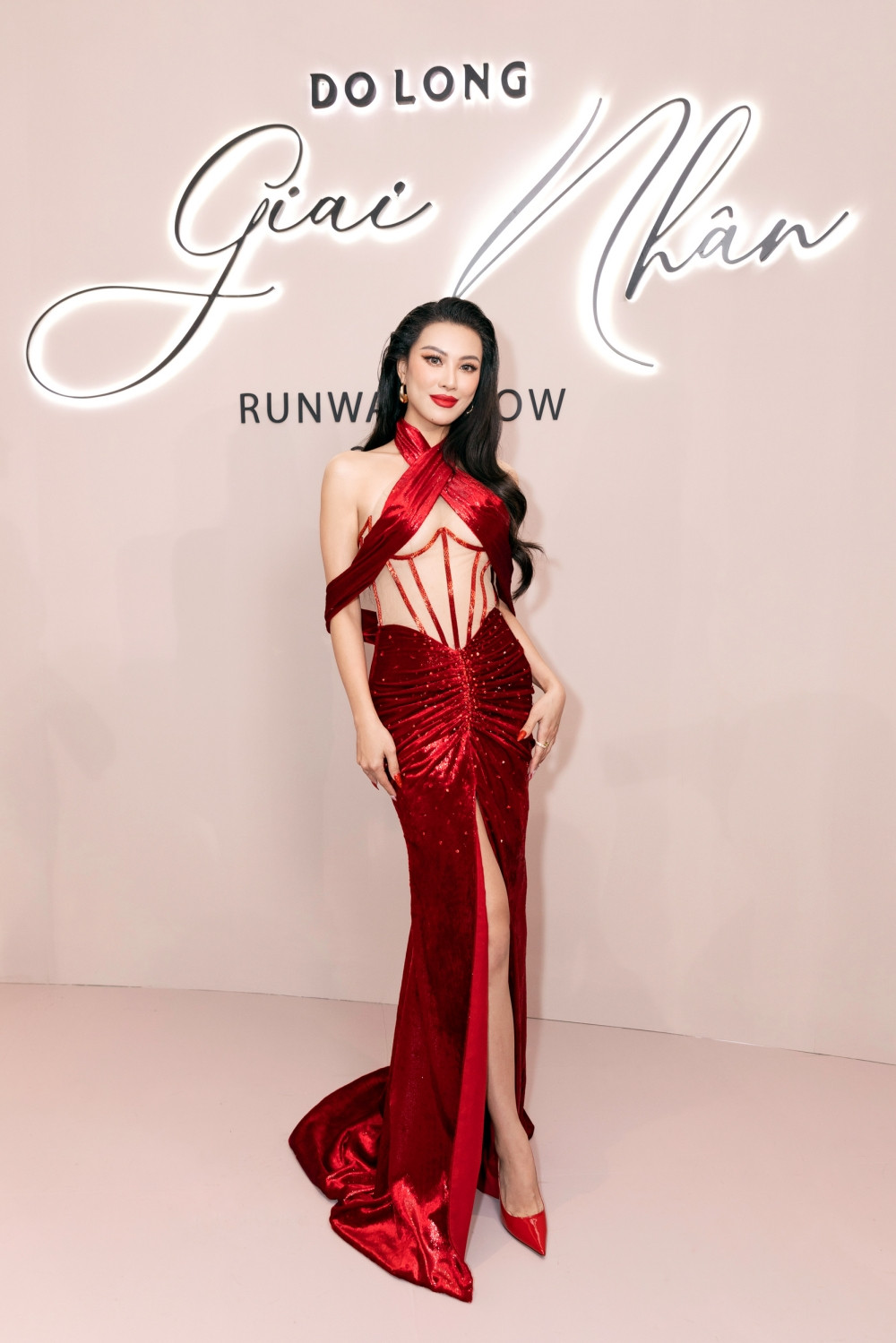 Hoa hậu Đoàn Thiên Ân là một trong những người bạn thân thiết của NTK Đỗ Long. Cô ghi điểm bởi set đồ mang tông đỏ có điểm nhấn dập ly.