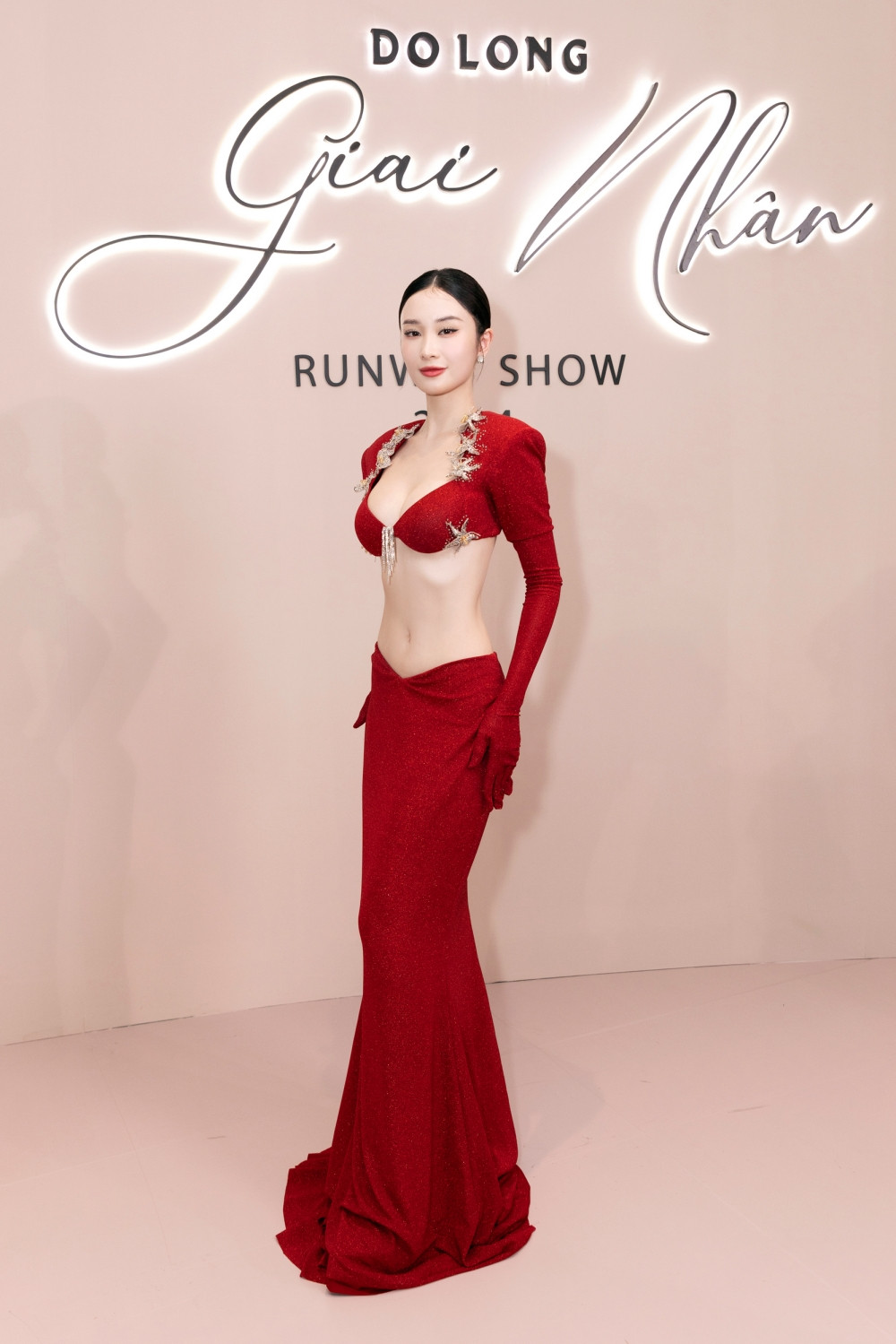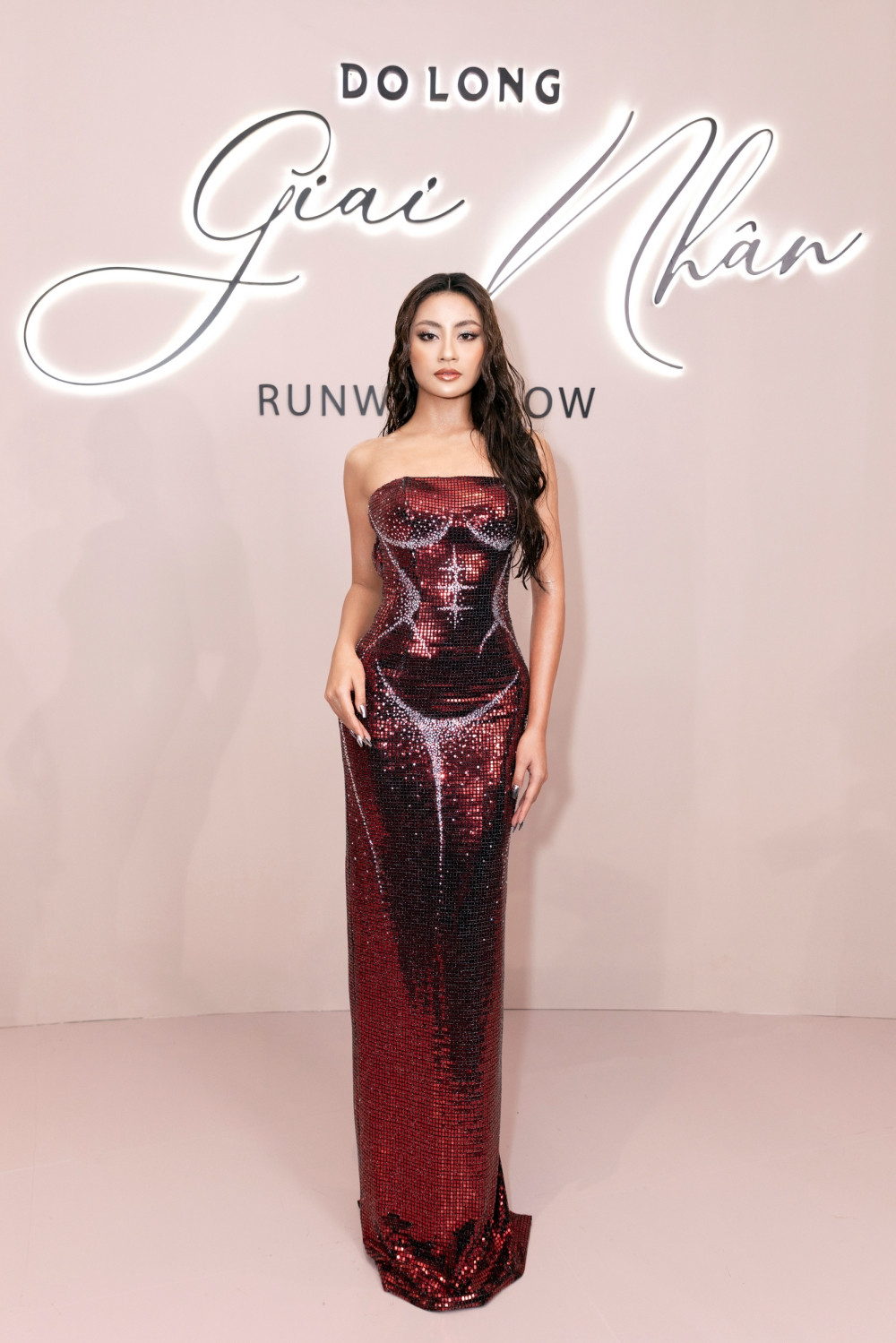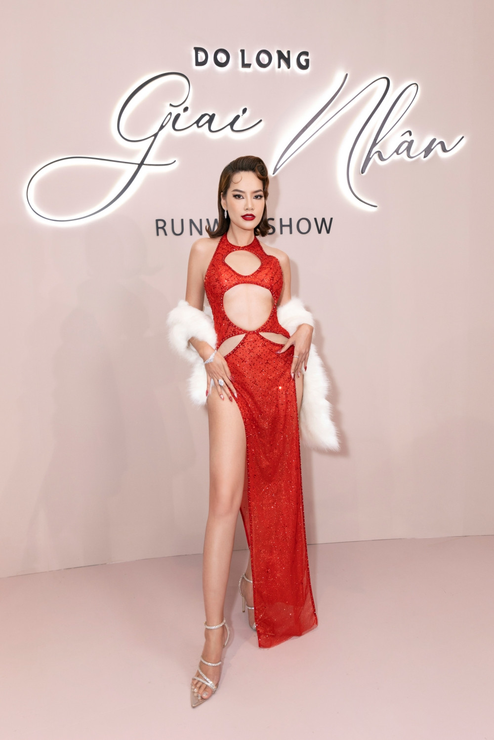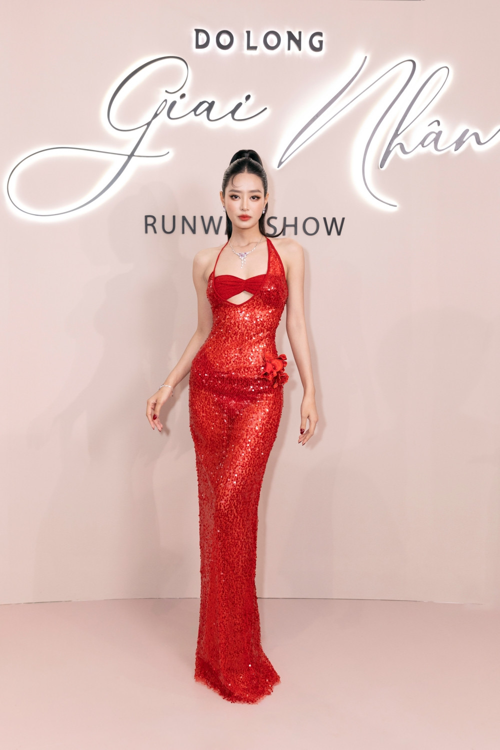 Hoa hậu Đoàn Thiên Ân là một trong những người bạn thân thiết của NTK Đỗ Long. Cô ghi điểm bởi set đồ mang tông đỏ có điểm nhấn dập ly.