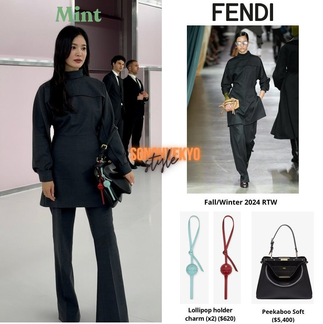 Nữ diễn viên 8X ngồi hàng ghế đầu, diện trang phục đến từ BST Thu Đông 2024 của thương hiệu. Thiết kế tông màu xám sử dụng kỹ thuật may đo cao cấp, kết hợp cùng túi xách da mang đến diện mạo thanh lịch cho Song Hye Kyo.