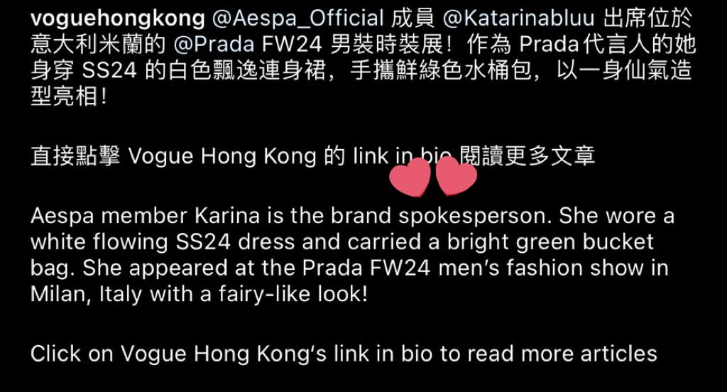 Vogue Hồng Kông đăng tải hình ảnh của Karina aespa tại sự kiện và gọi cô là "brand spokesperson" (người phát ngôn thương hiệu).