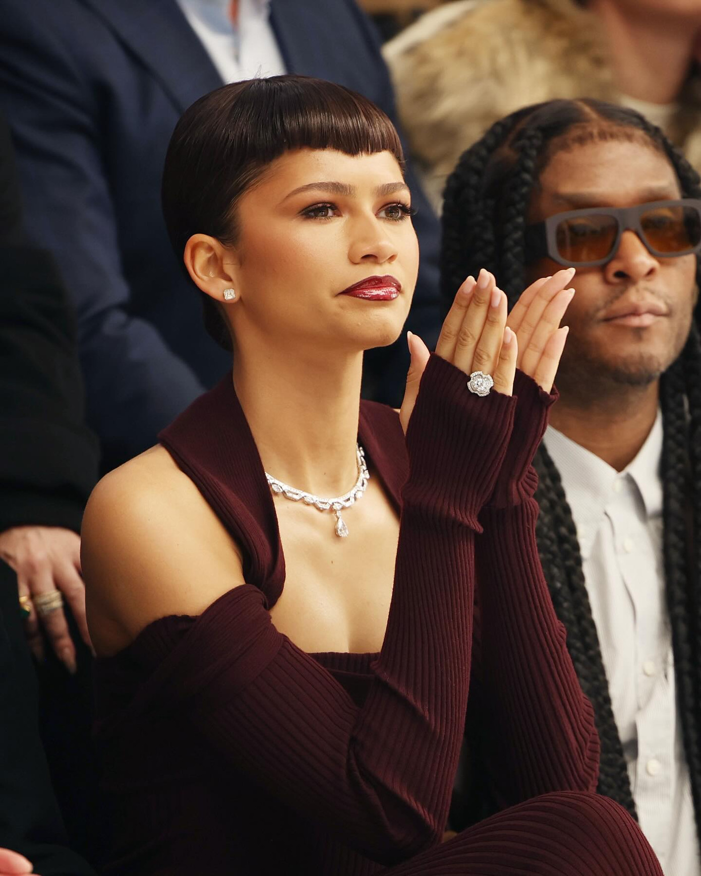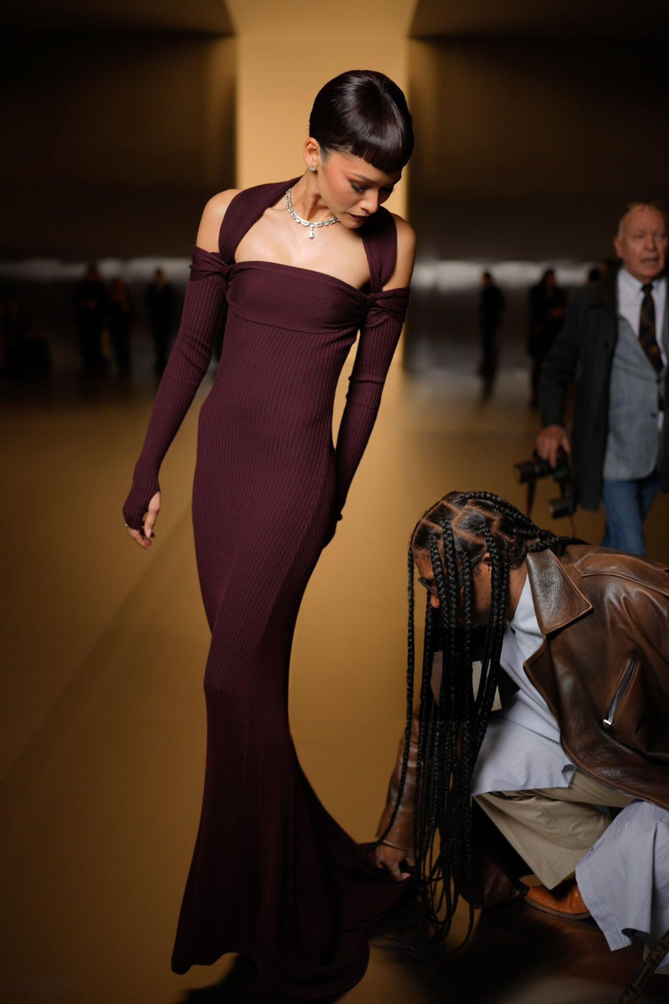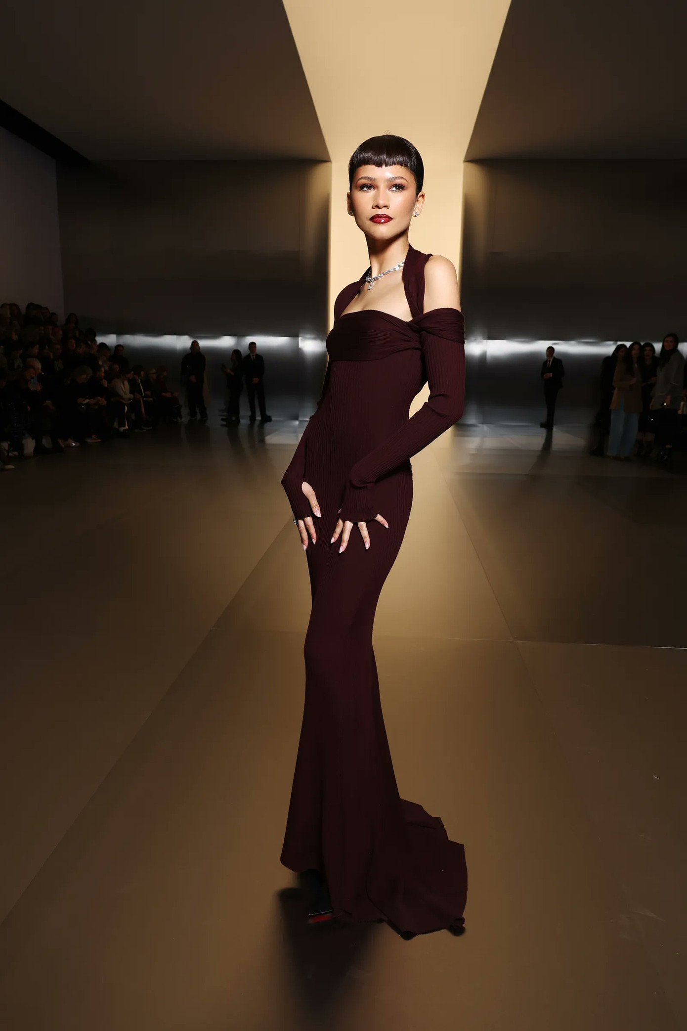 Zendaya cũng là ngôi sao được các tín đồ thời trang hết lời khen ngợi khi xuất hiện tại show Fendi. Cô nàng thu hút mọi ống kính với thiết kế đầm ôm sát màu đỏ đun. Kiểu tóc búi thấp, tóc mái cá tính cùng khí chất ngút ngàn của nữ diễn viên ghi điểm tuyệt đối.