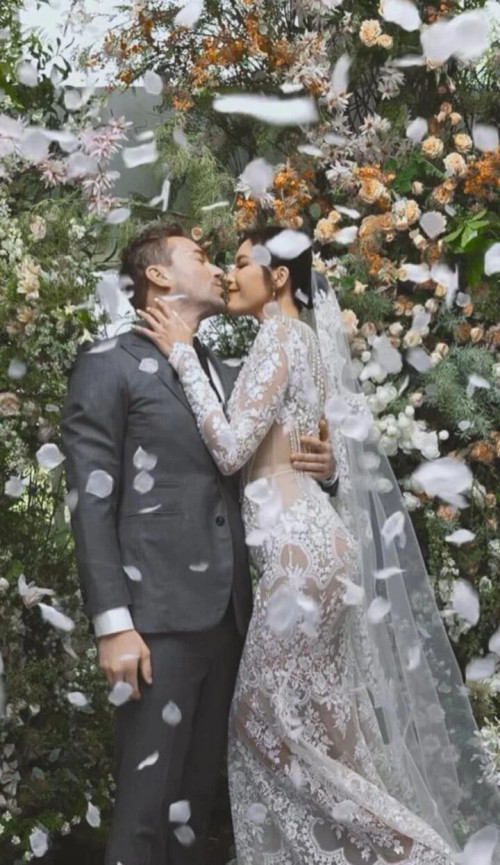 Ngày 18/3, Minh Tú chia sẻ video hậu trường chụp ảnh cưới với chồng ngoại quốc. Siêu mẫu diện thiết kế ren xuyên thấu với phần họa tiết cầu kỳ. Bối cảnh chụp ảnh cưới là bức tường hoa và những cánh hoa bay khá lãng mạn.