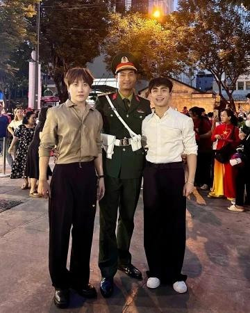 Hình ảnh ca sĩ MONO, diễn viên Phát La xuống đường xem sơ duyệt diễu binh, diễu hành thu hút sự quan tâm. Cả hai hội ngộ Đại úy Phạm Văn Sơn - người từng góp mặt trong chương trình Sao nhập ngũ 2024.