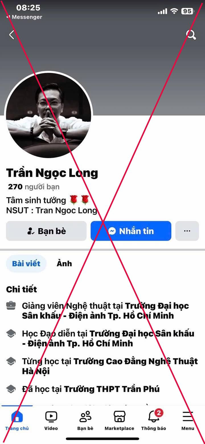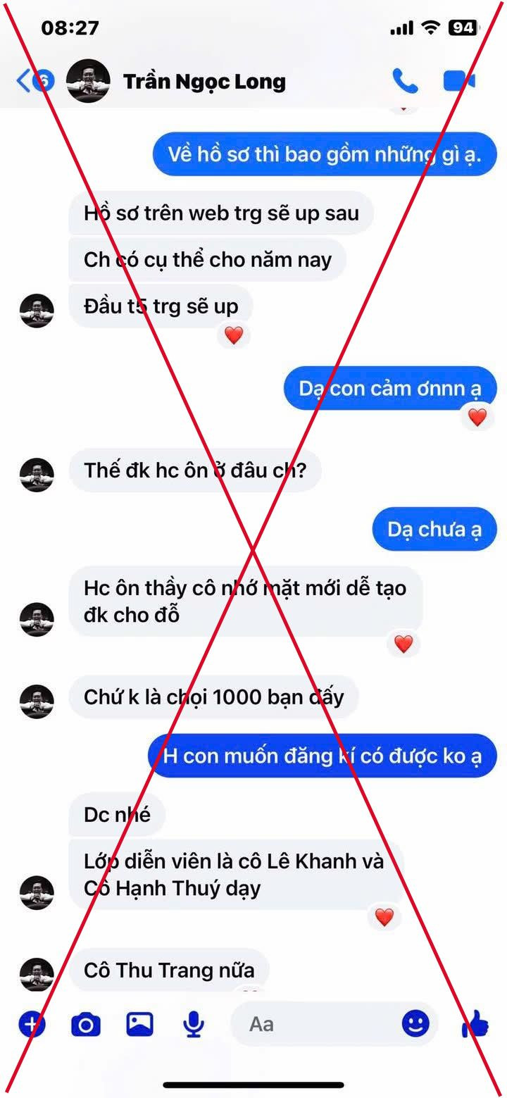 Chiều 28/4, NSƯT Hạnh Thúy cảnh báo về tình trạng mạo danh giảng viên Đại học Sân khấu Điện ảnh TPHCM để tuyển học viên luyện thi vào trường. Cụ thể, một tài khoản tự xưng là nghệ sĩ ưu tú, giảng viên Đại học Sân khấu Điện ảnh TPHCM.